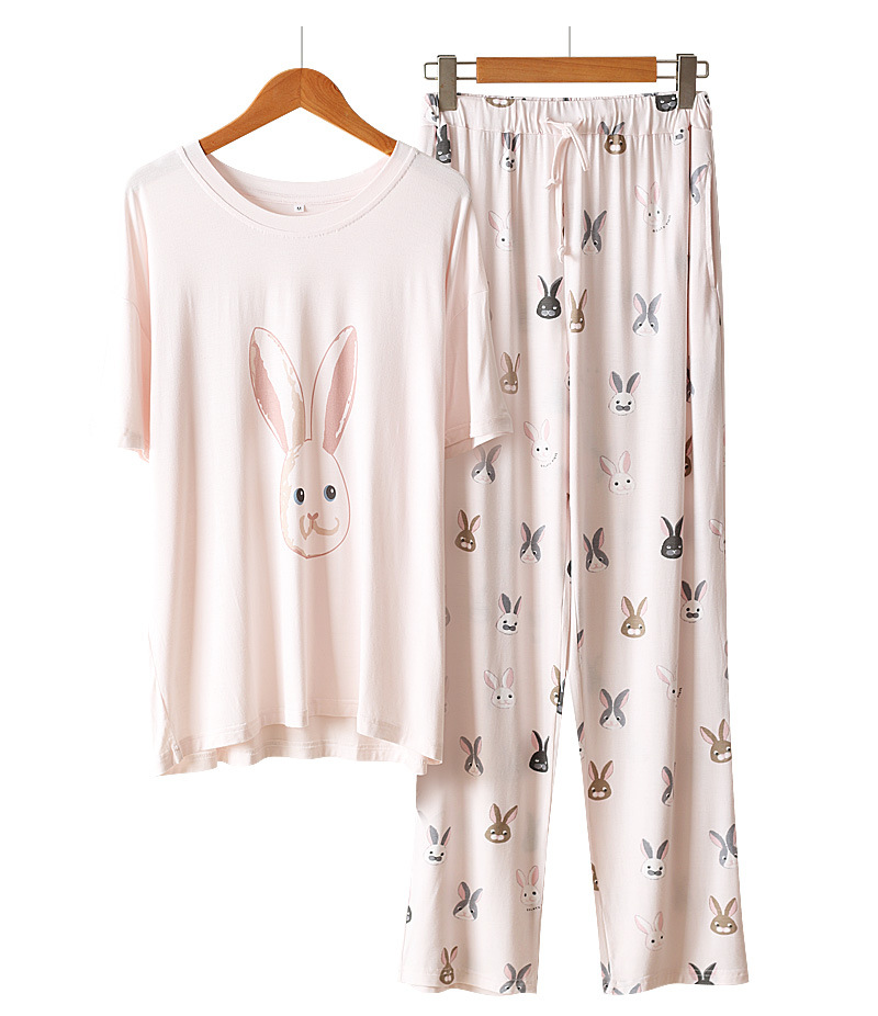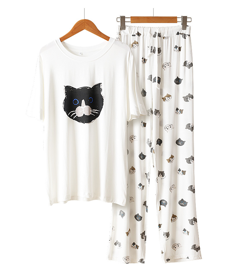 2023 일본 스타일 모달 잠옷 봄과 여름 여성용 반팔 바지 세트 얇은 만화 고양이 크루넥 가정 의류