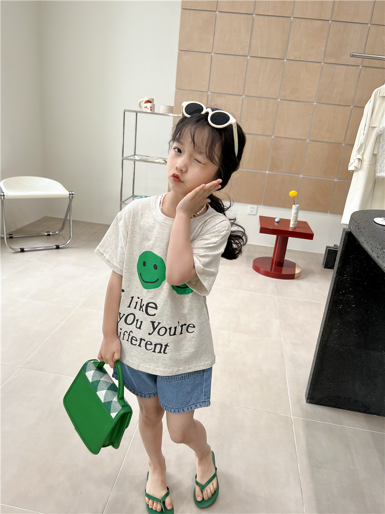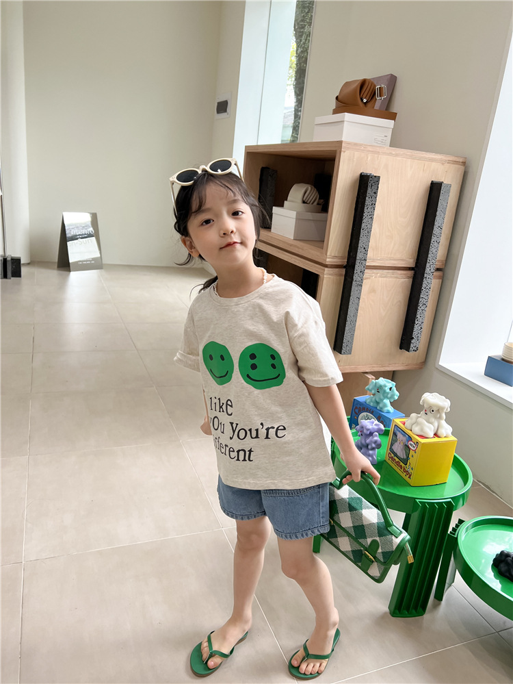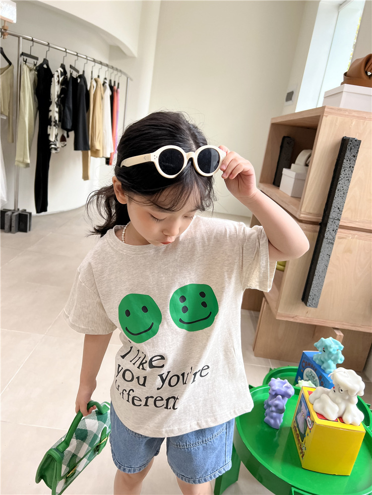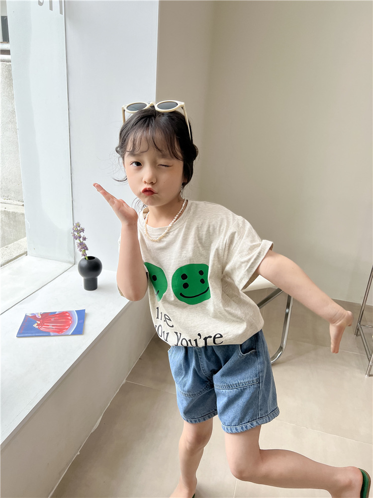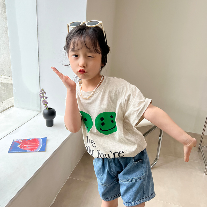 2022 여름 새로운 한국 여아 녹색 스마일 티셔츠 웨스턴 스타일 어린이 여름 흰색 반소매 탑 A274스토어 가기