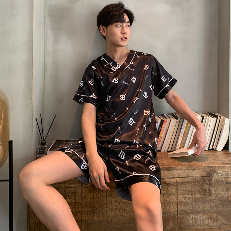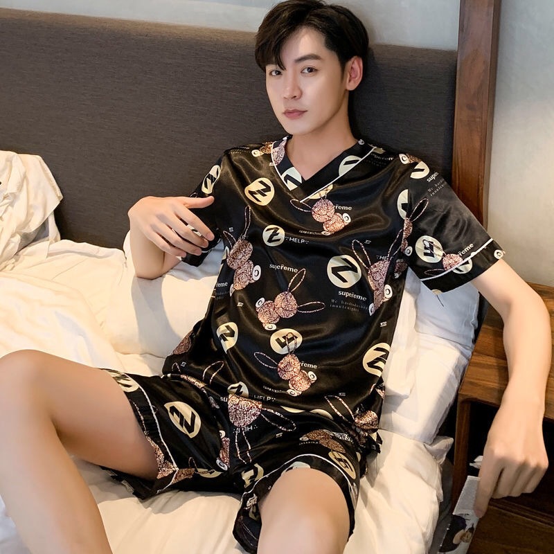잠옷 남자 여름 아이스 실크 얇은 반팔 투피스 세트 한국식 대형 루즈 남성용 아이스 실크 홈 의류
