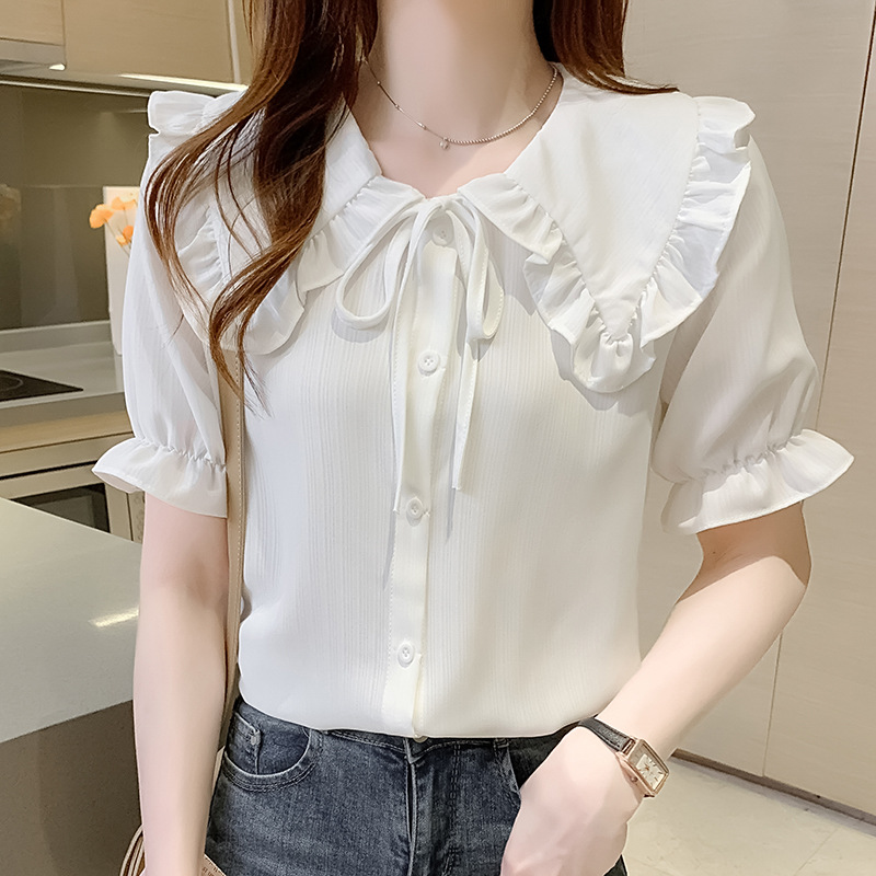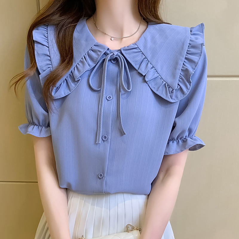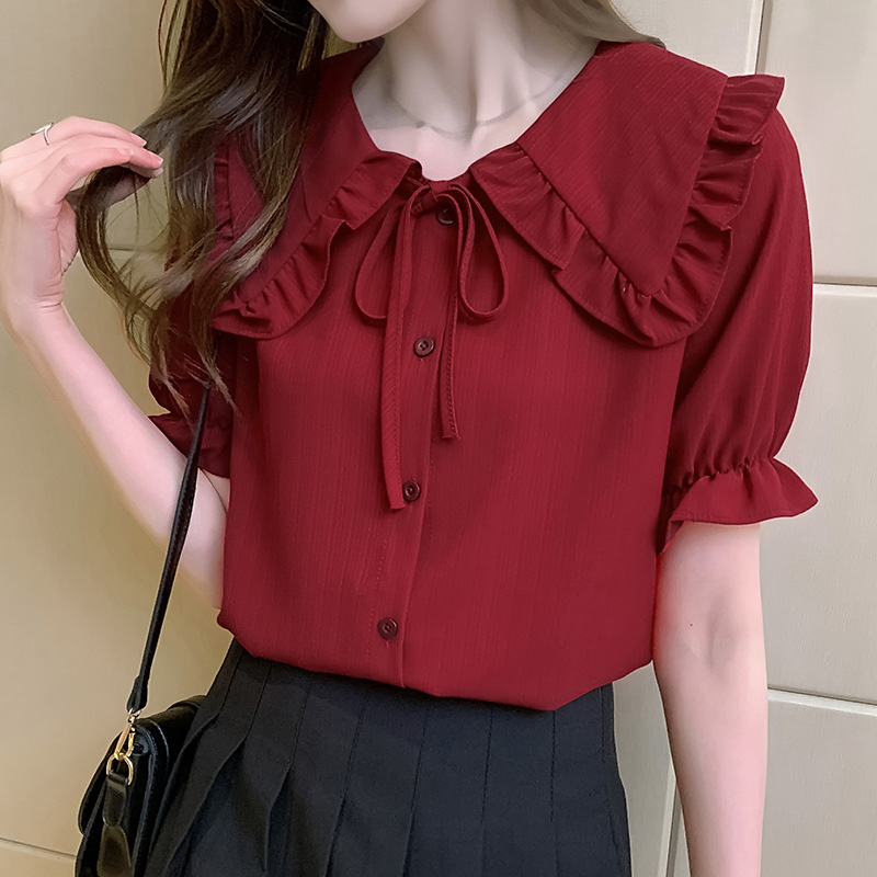 인형 칼라 셔츠 여성용 긴팔 봄과 가을 2023 새로운 달콤한 나이 감소 탑 레드 러플 쉬폰 셔츠스토어 가기