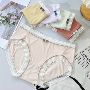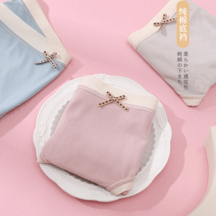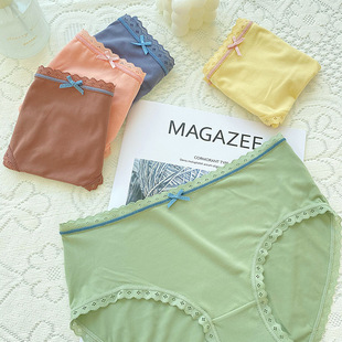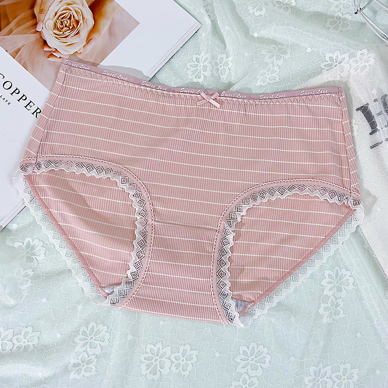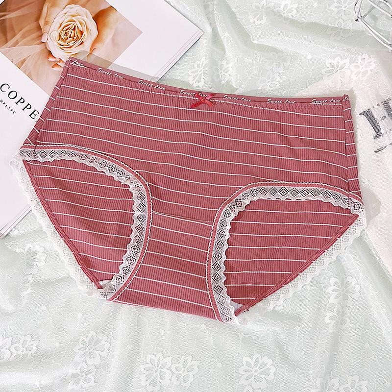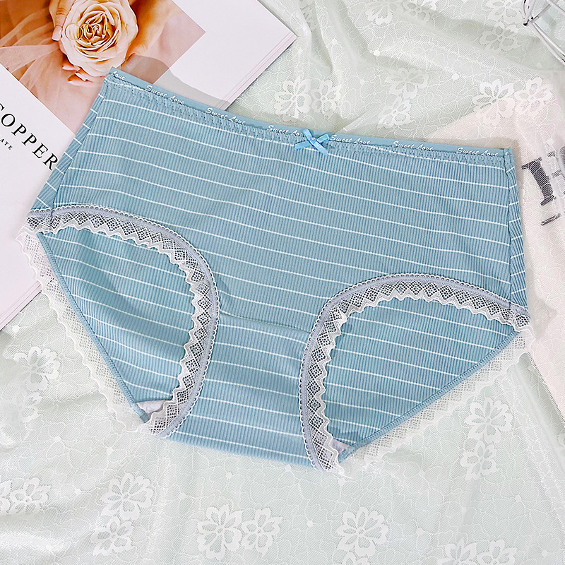 화려한 니트 면 자카드 소녀 팬티, 중간 허리 리본, 순면 가랑이, 레이스 스트라이프 여성 삼각 팬티