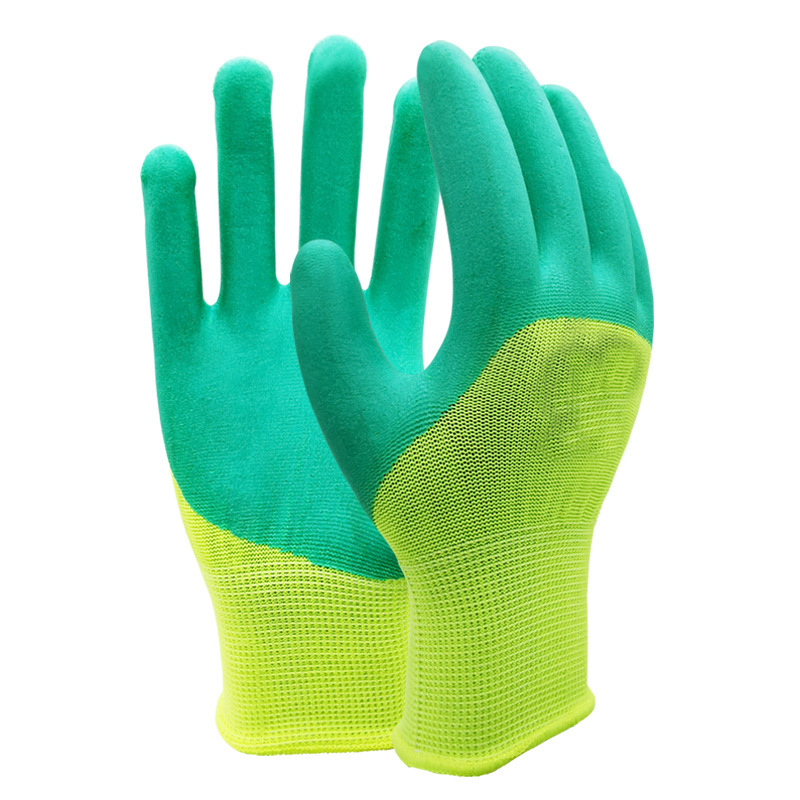 통기성 강화 손가락 13 핀 나일론 폴리에스터 형광 노랑 녹색 원사 녹색 접착제 검은 손가락 노동 보호 장갑 내마모성 인쇄 라벨