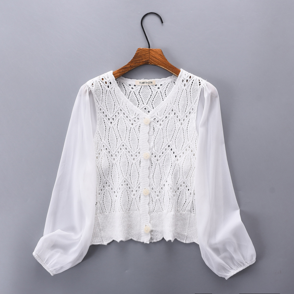 마름모꼴 니트 패치 워크 쉬폰 긴팔 가디건 얇은 V-넥 유행 레이스 셔츠 가짜 투피스 스위트 탑