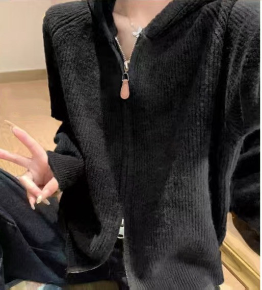 후드 더블 지퍼 가디건 여성용 2025 봄 두꺼운 부드러운 스웨터 아메리칸 스타일 루즈핏 코트