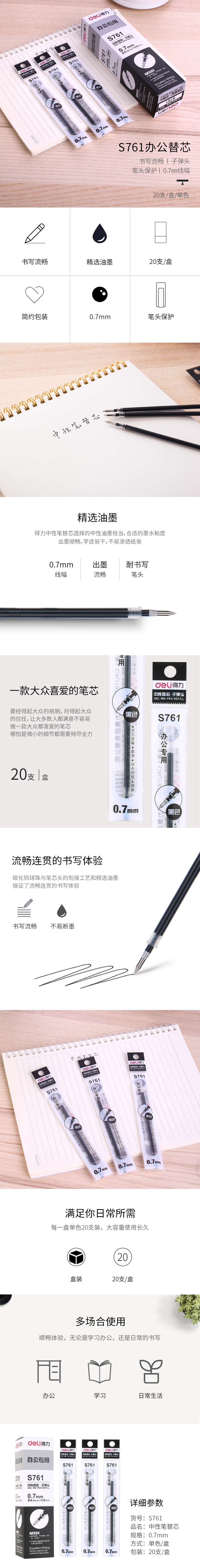 델리 S761 중립 리필 0.7mm 총알 리필 탄소 리필 물 리필 쓰기 리필
