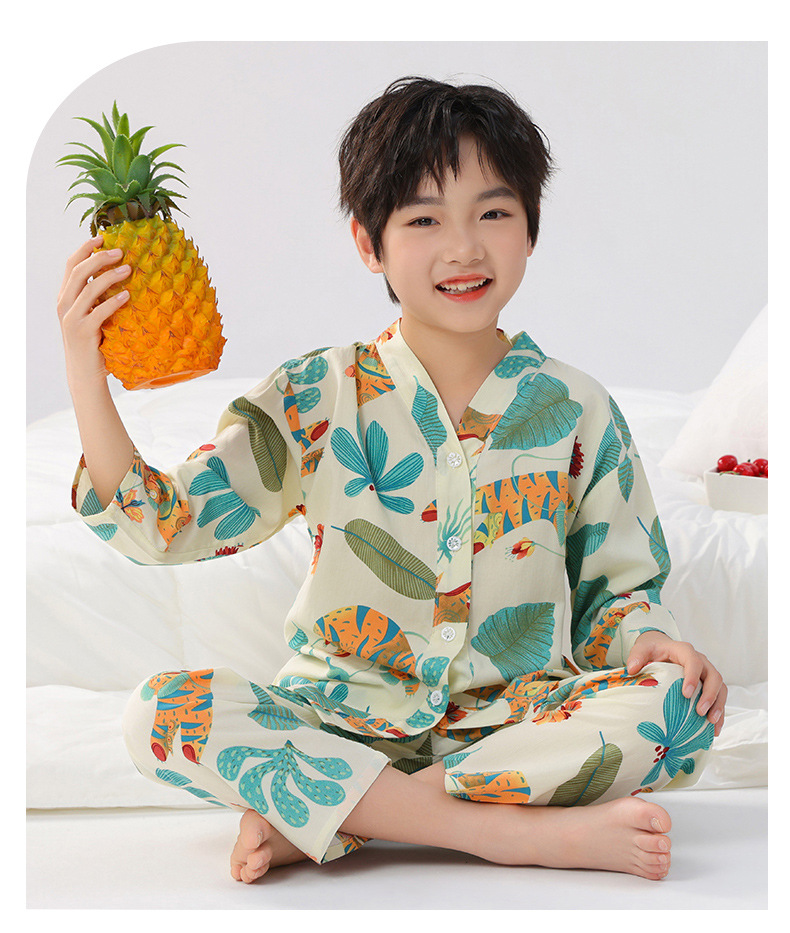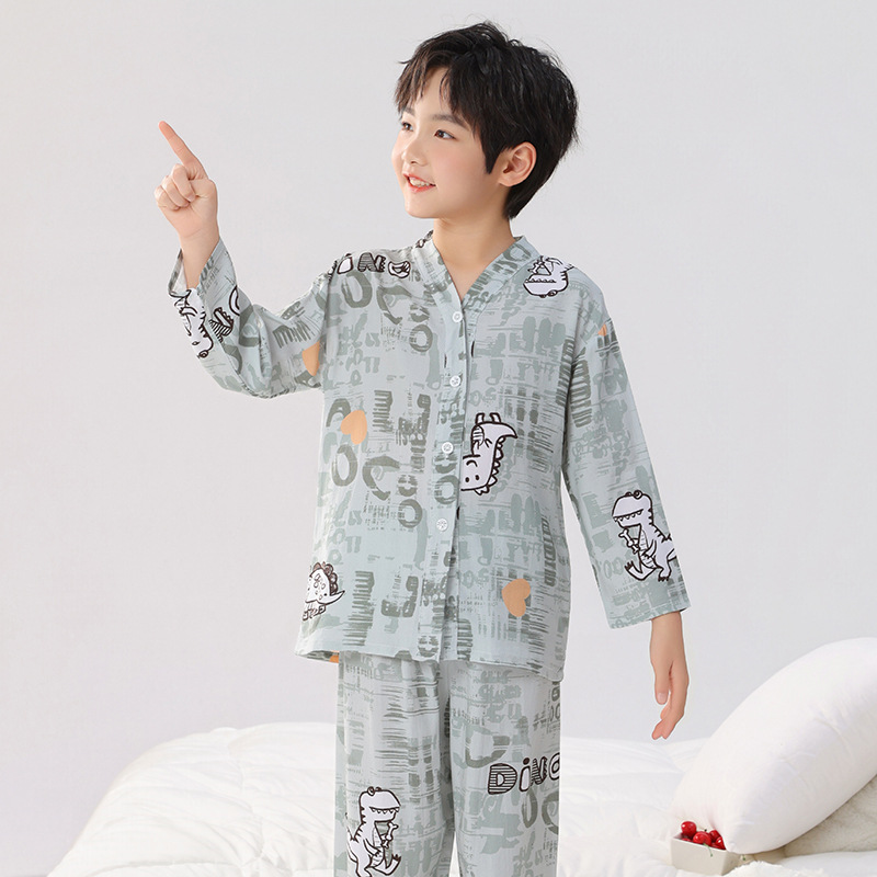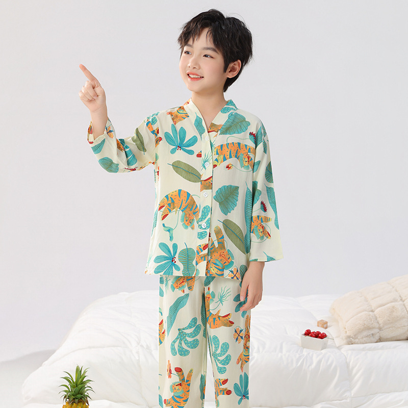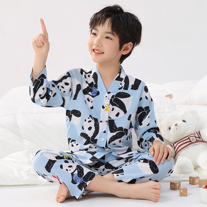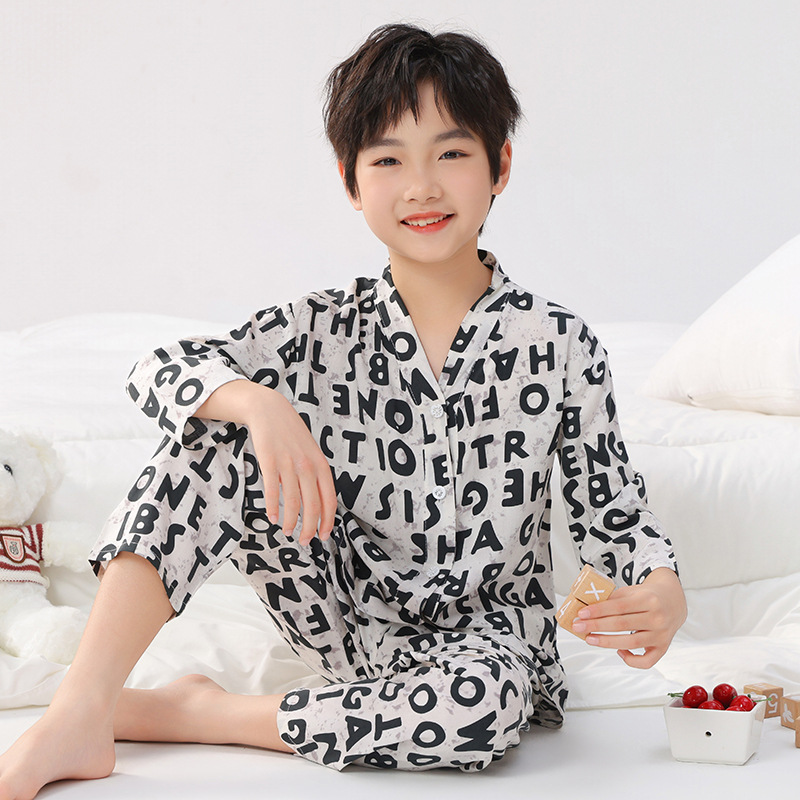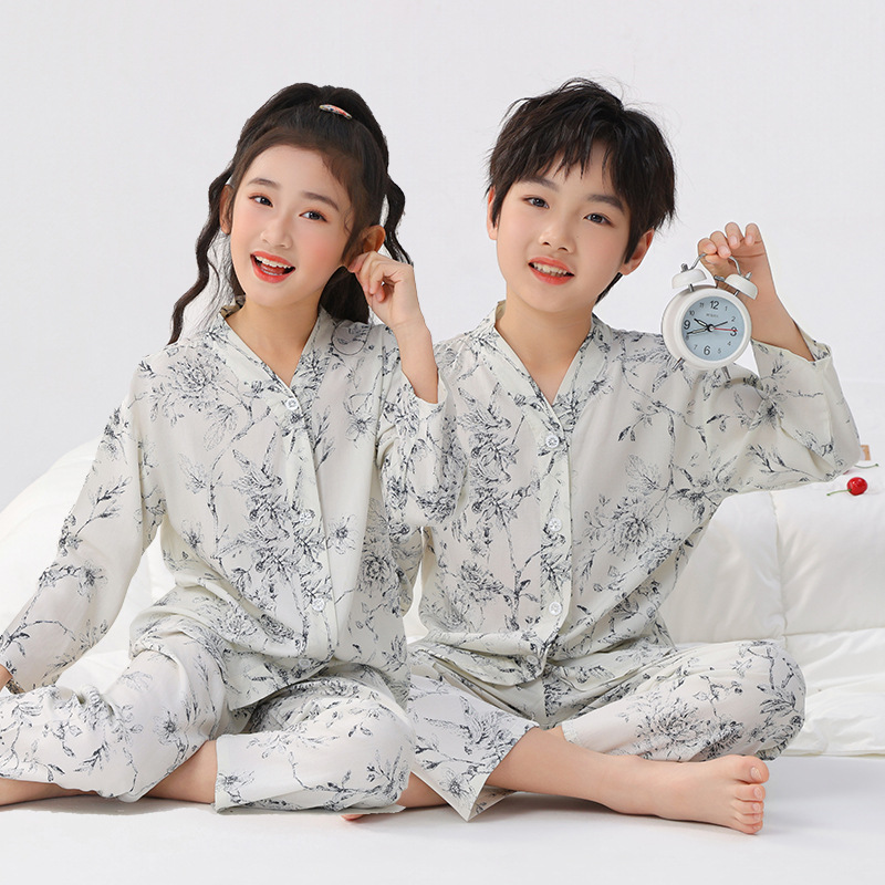 면 실크 잠옷, 아동복, 에어컨 의류, V 넥 긴팔 소년 소녀, 여름 의류, 아동복, 면 여름스토어 가기