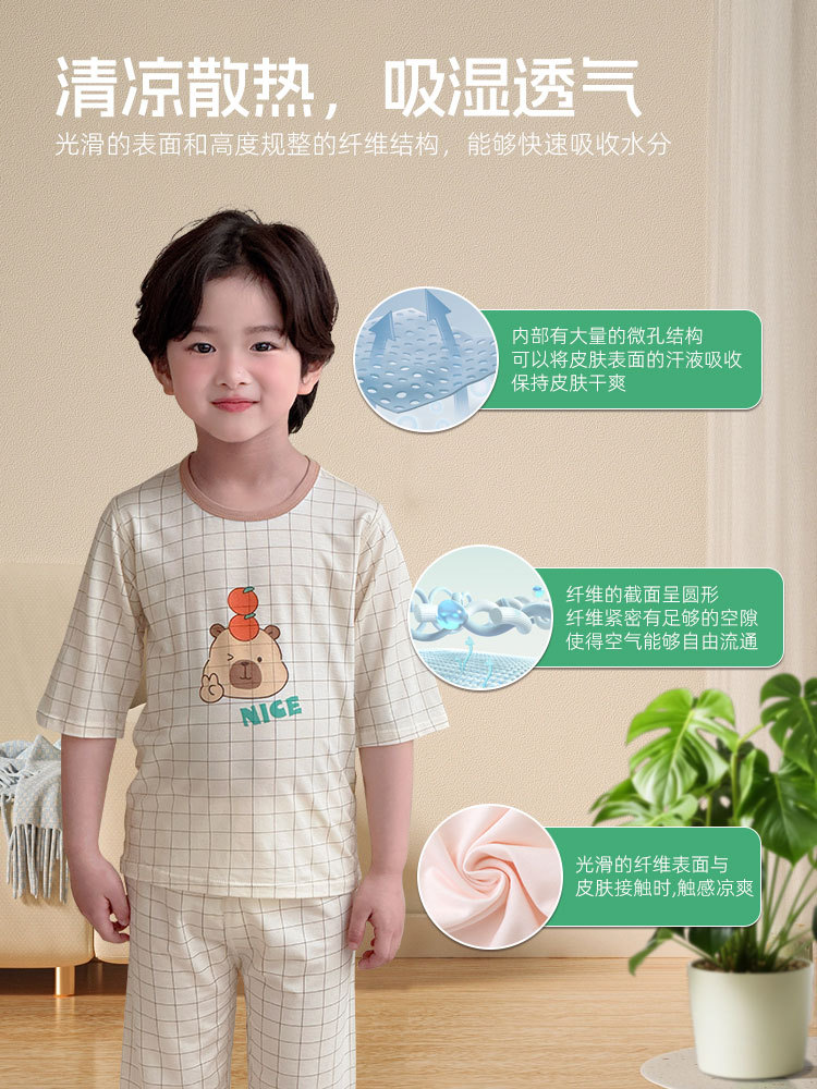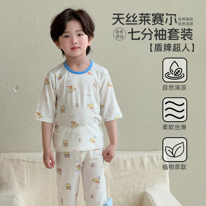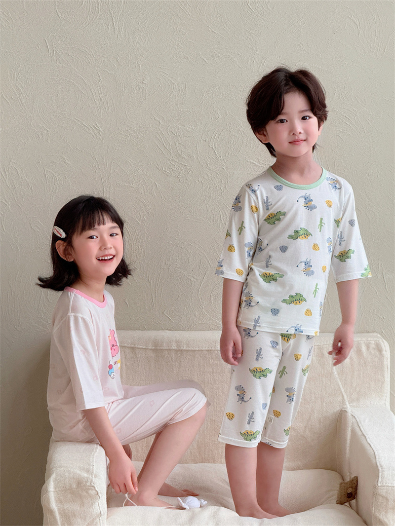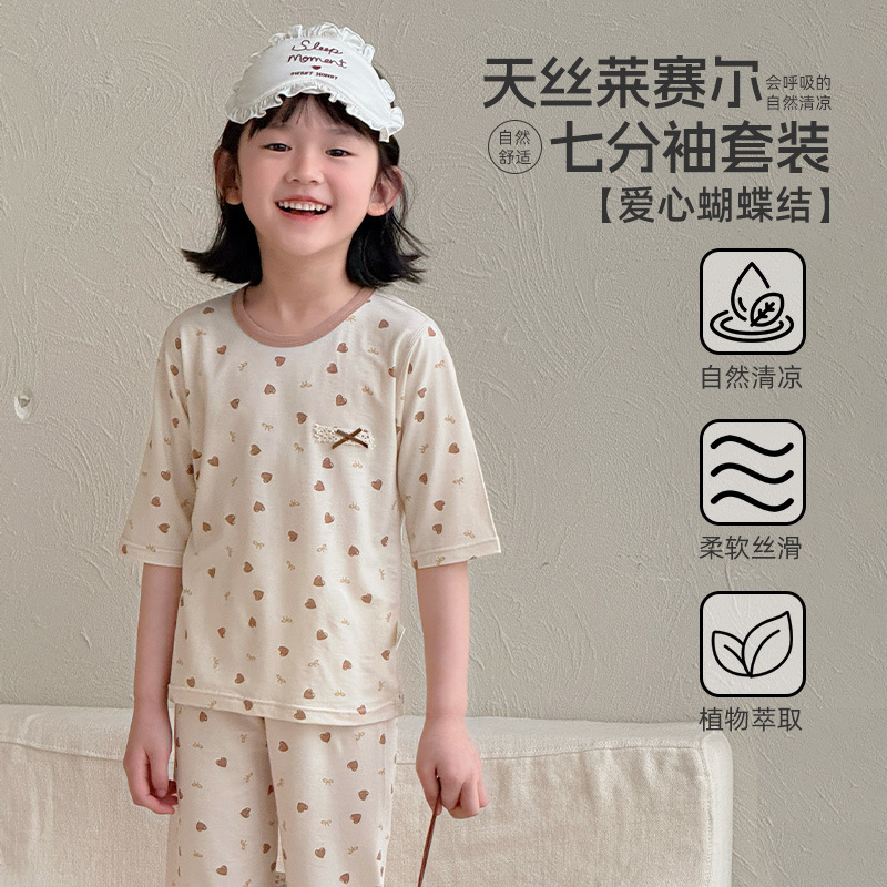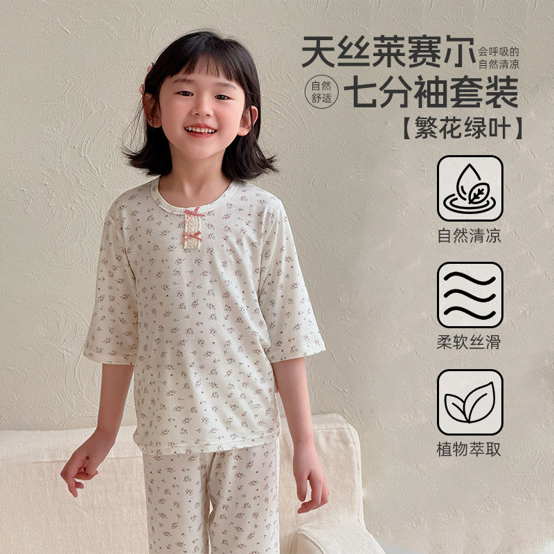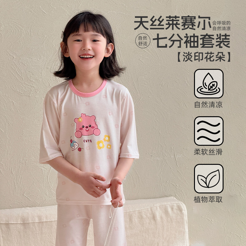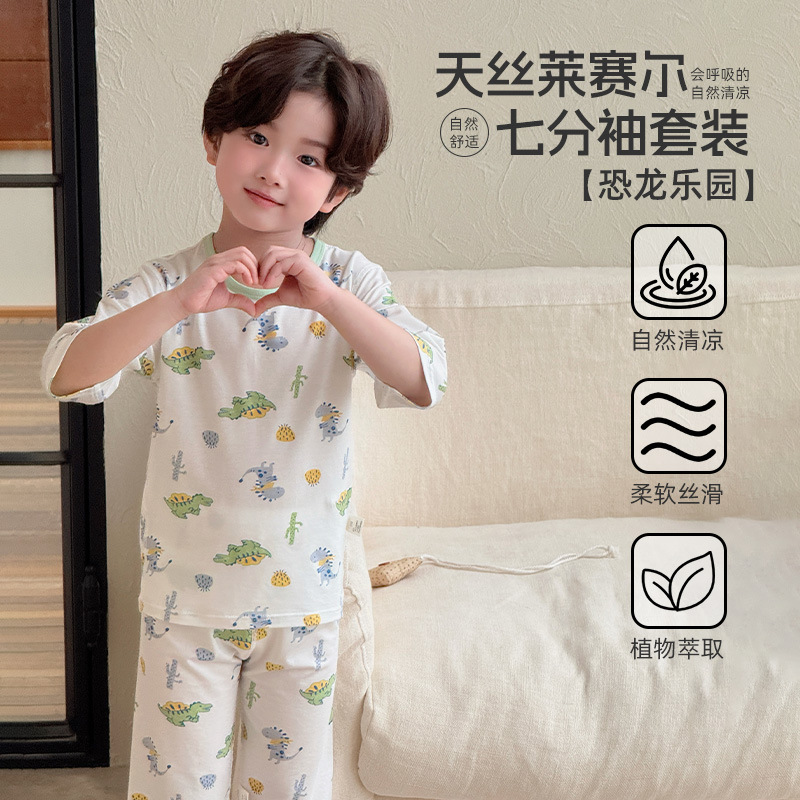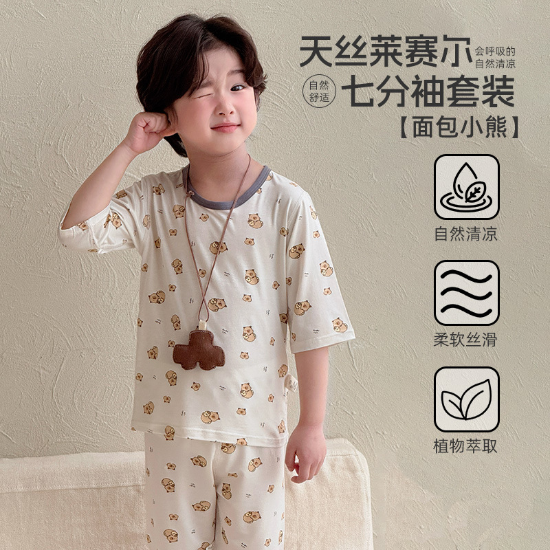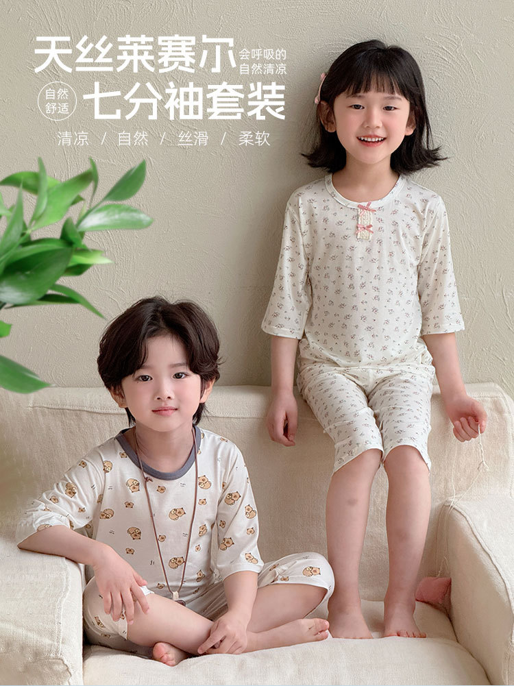어린이 여름 텐셀 Lyocell 소매 세트 소년과 소녀 아기 얇은 홈 옷 파자마 에어컨 옷