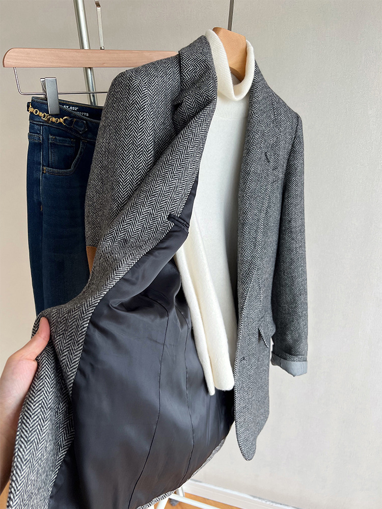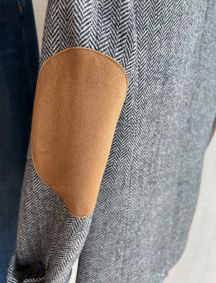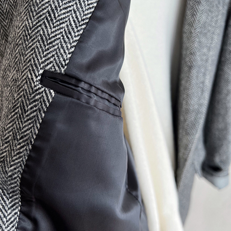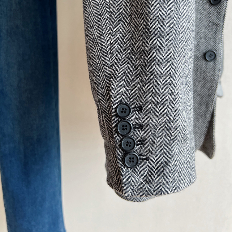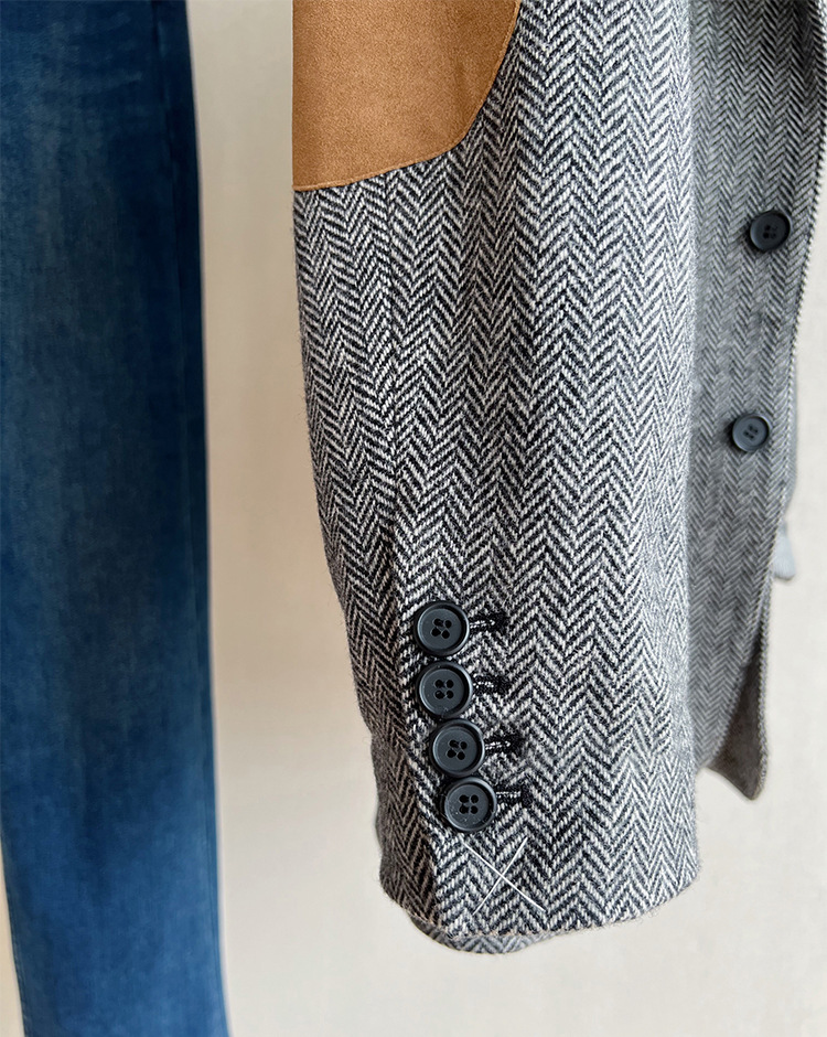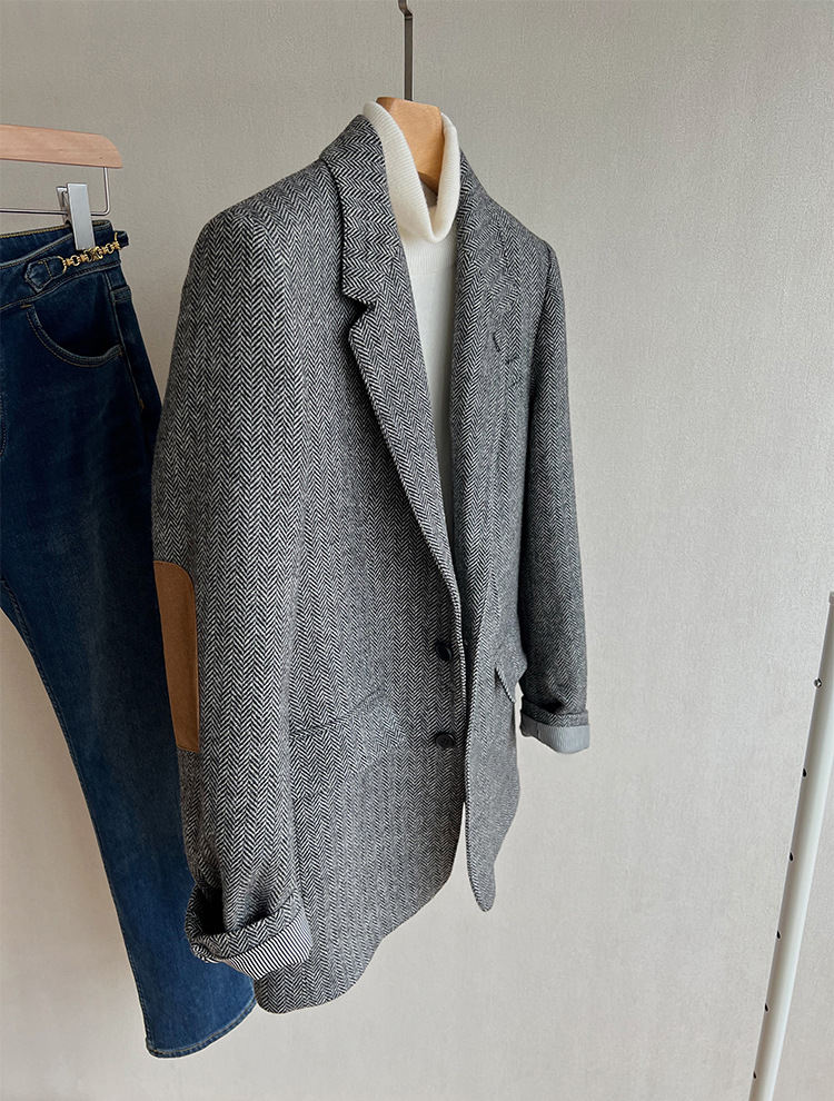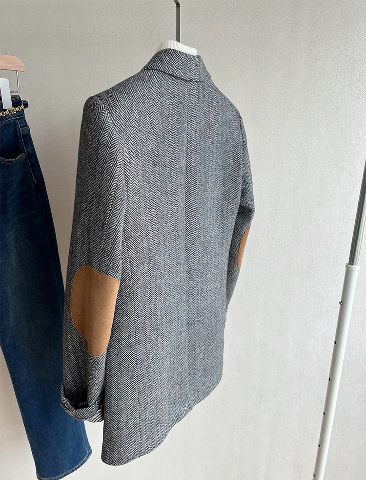 스팟 봄, 가을 캐주얼 원사 염색 헤링본 패턴 팔꿈치 및 가죽 복고풍 울 정장 재킷 여성용스토어 가기
