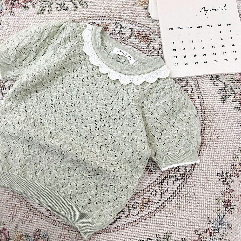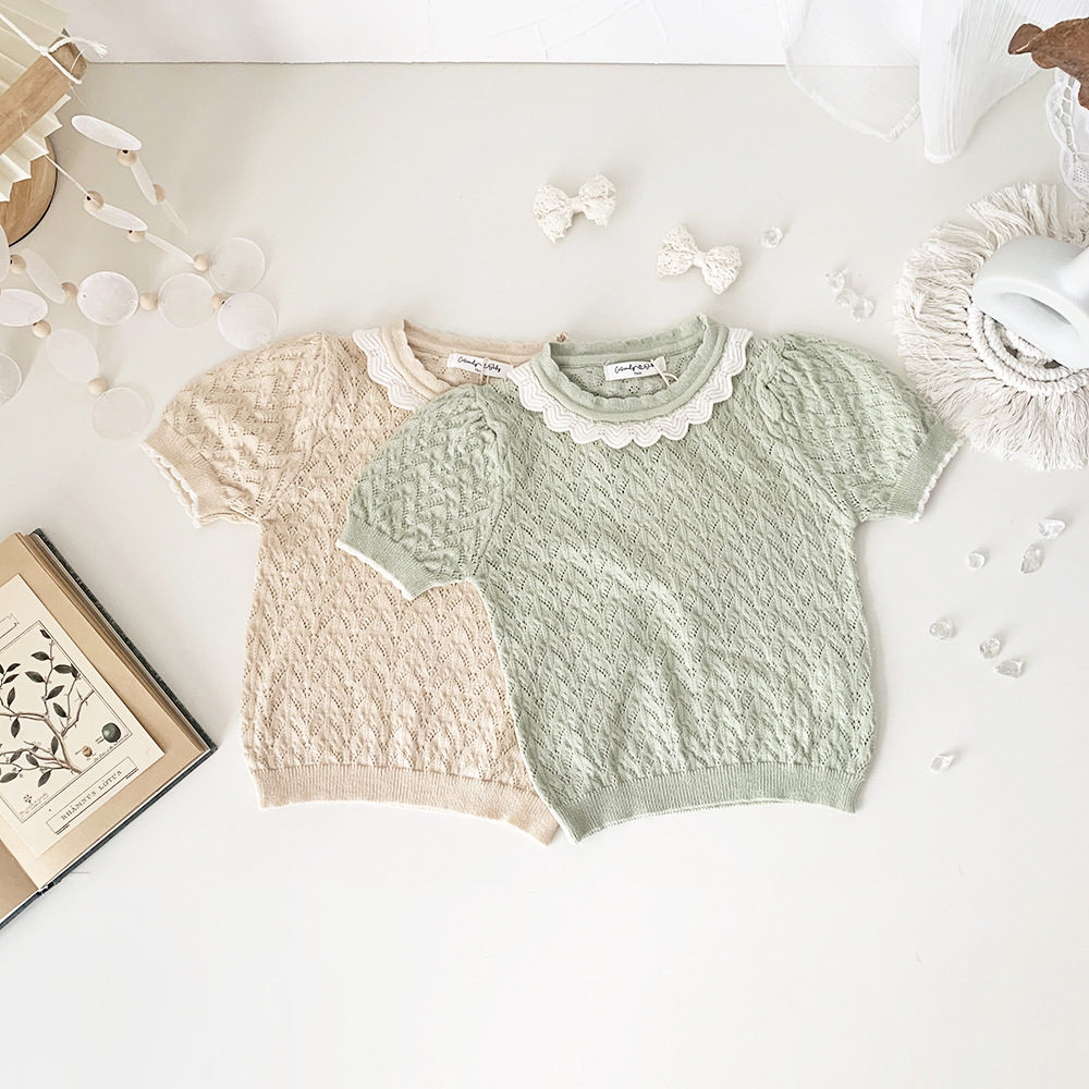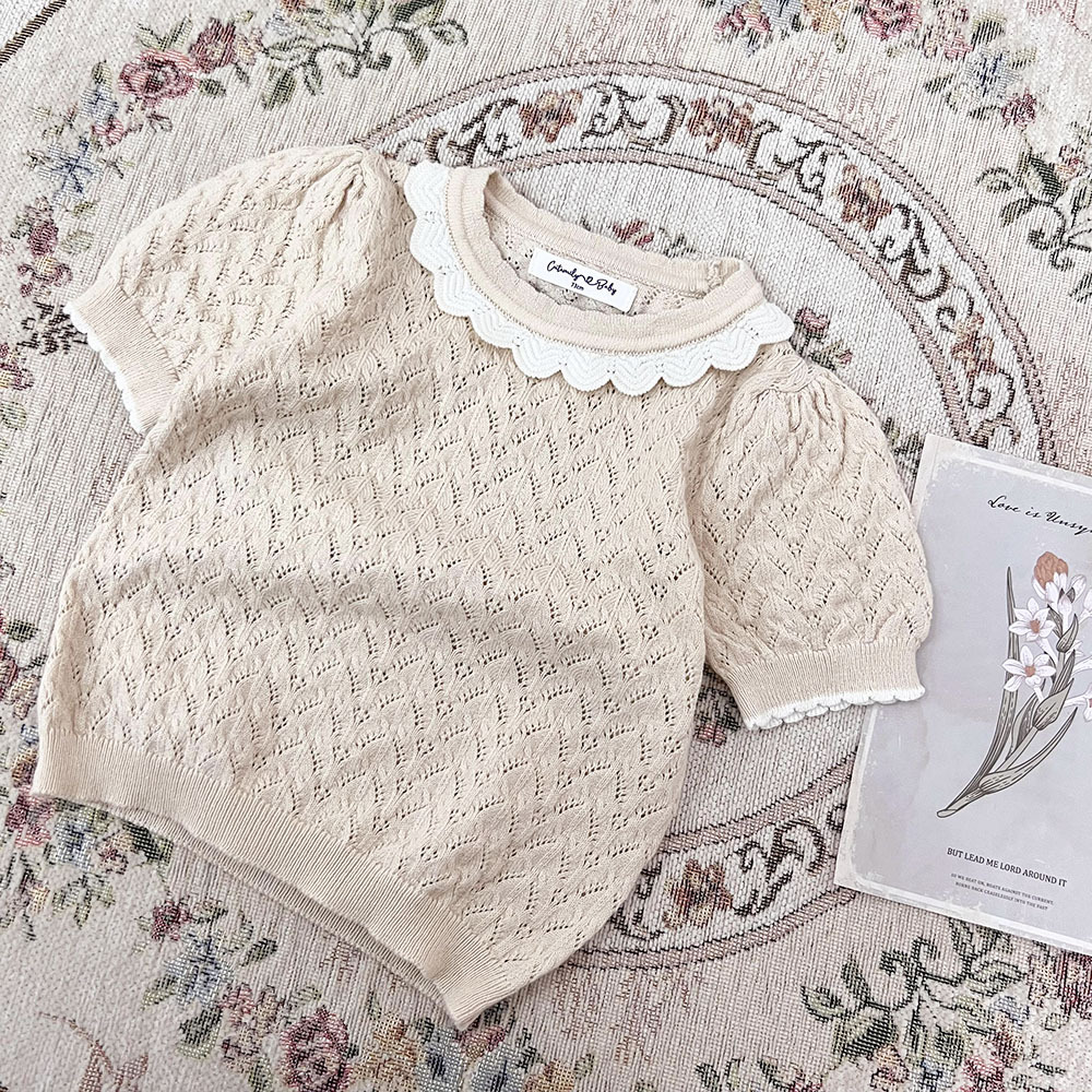 Cutemily의 크로스 보더 아기 소녀 풀오버 중공 스웨터 얇은 귀여운 웨이브 칼라 니트 짧은 소매