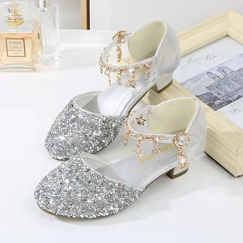 2022 새로운 소녀 크리스탈 신발 학생 공연 신발 하이힐 신발 여름 샌들 공장 직접 머리카락 생성