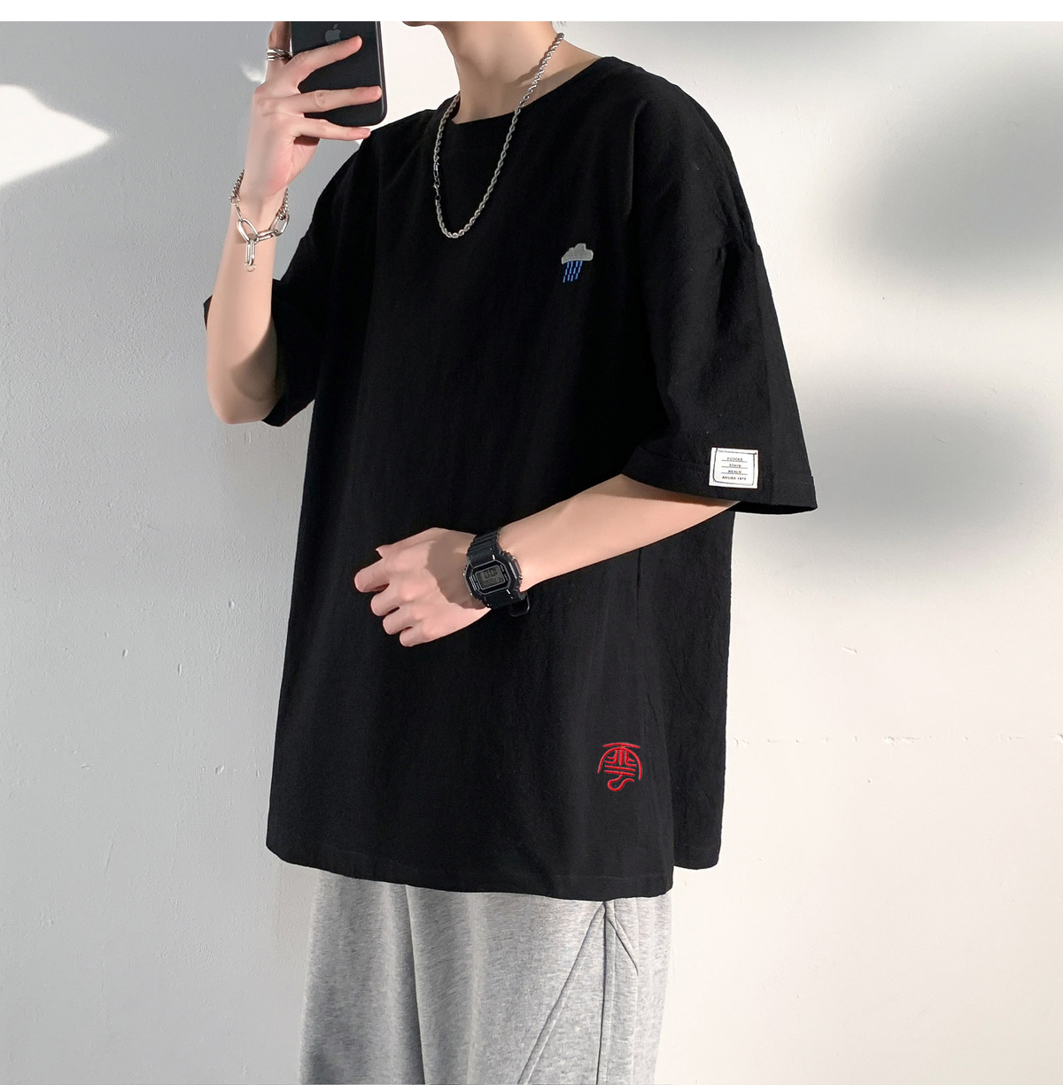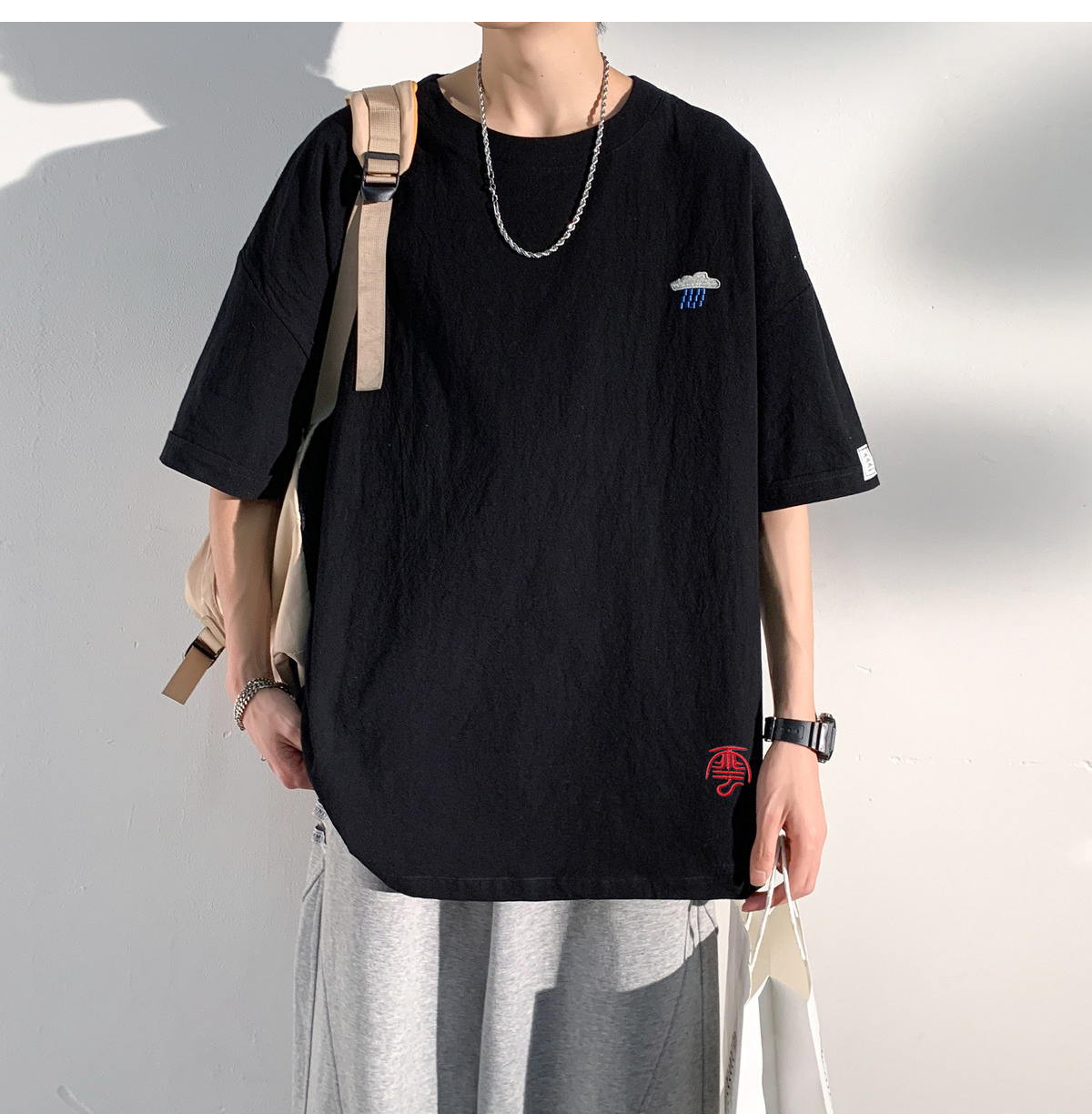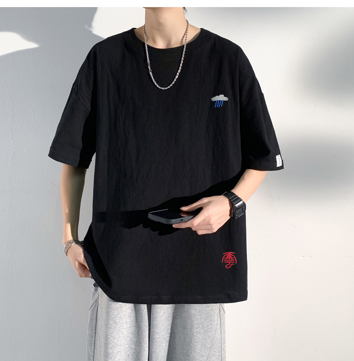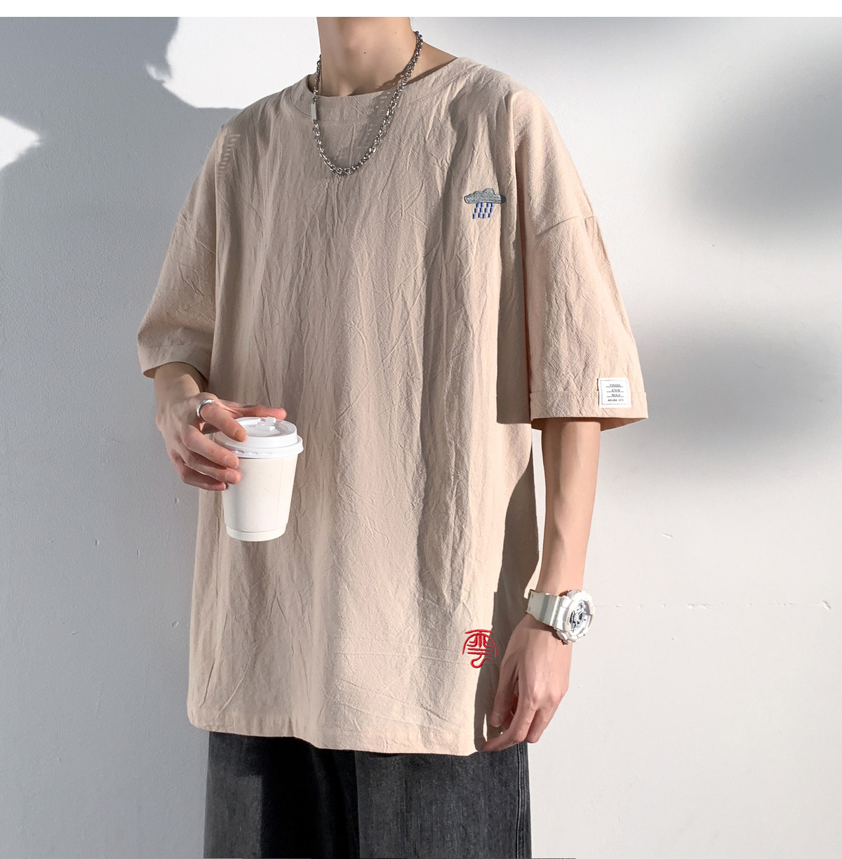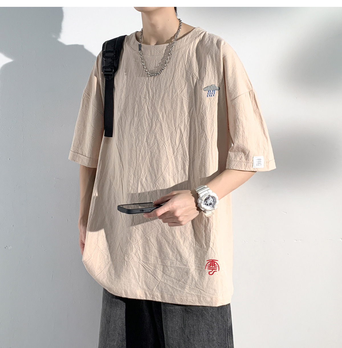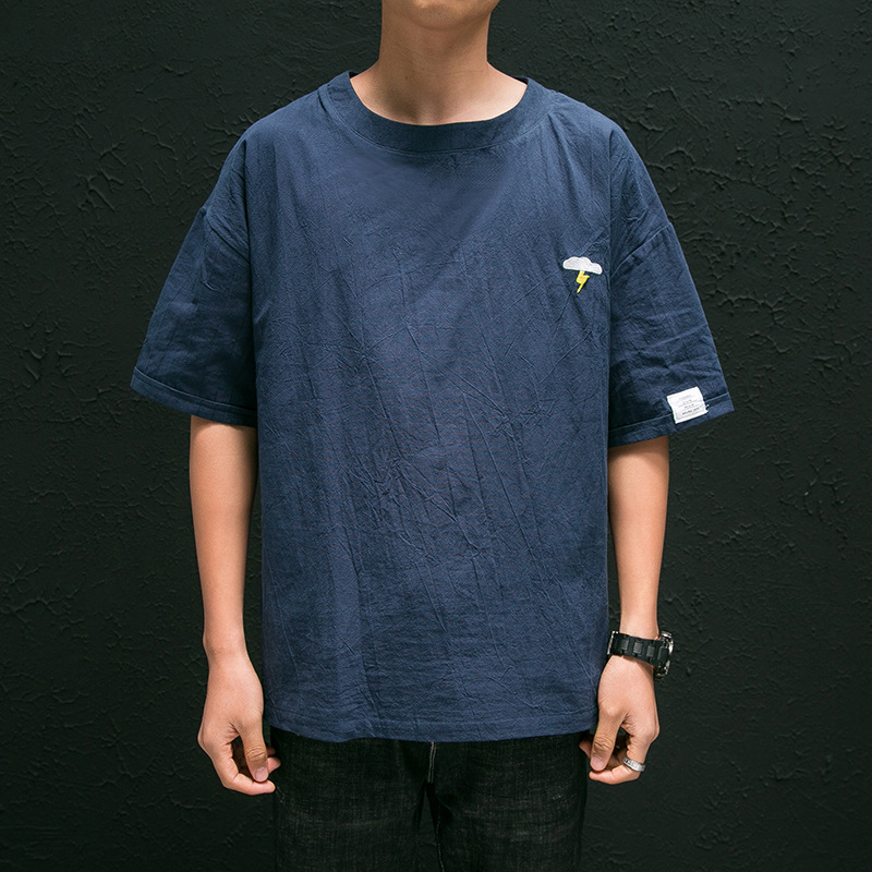 코튼 및 리넨 반팔 티셔츠 남성용 여름 모방 리넨 마이크로 숄더 남성 중국 스타일 자수 느슨한 캐주얼 홍콩 스타일 라운드 넥스토어 가기