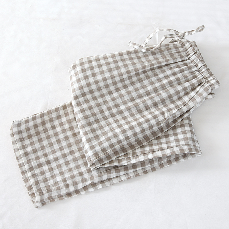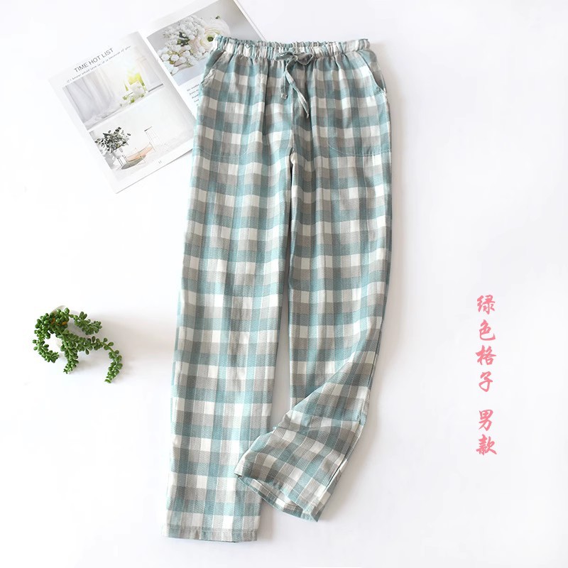 일본식 간단한 격자 무늬 거즈 면 여성용 잠옷 바지 봄과 여름 커플 얇은 면 느슨한 남성용 홈 바지