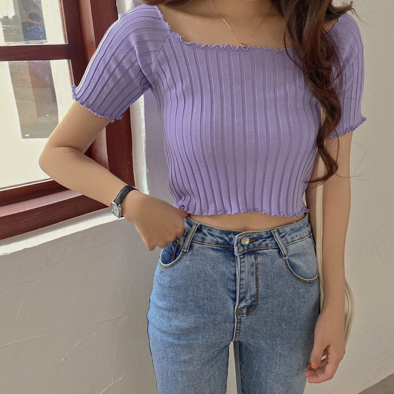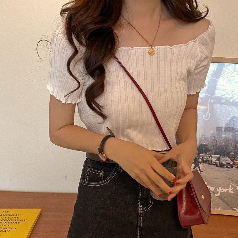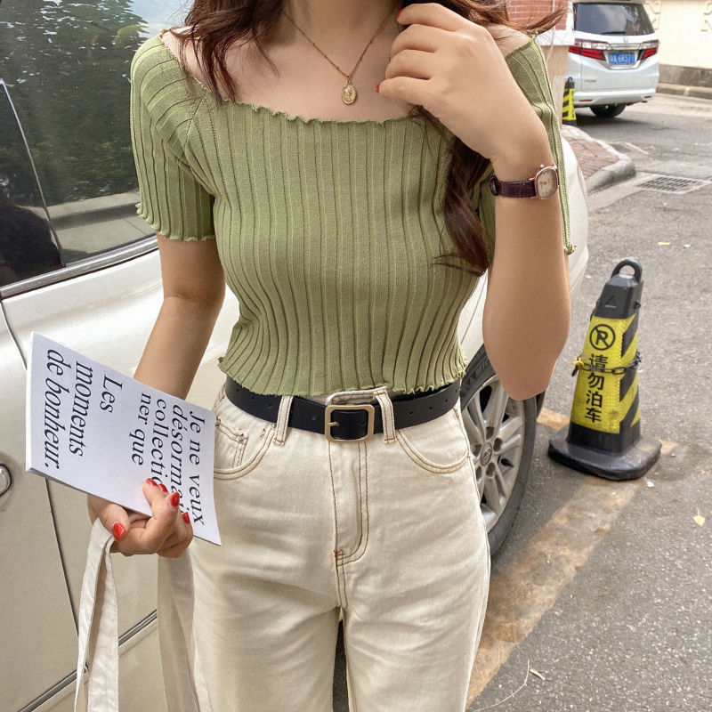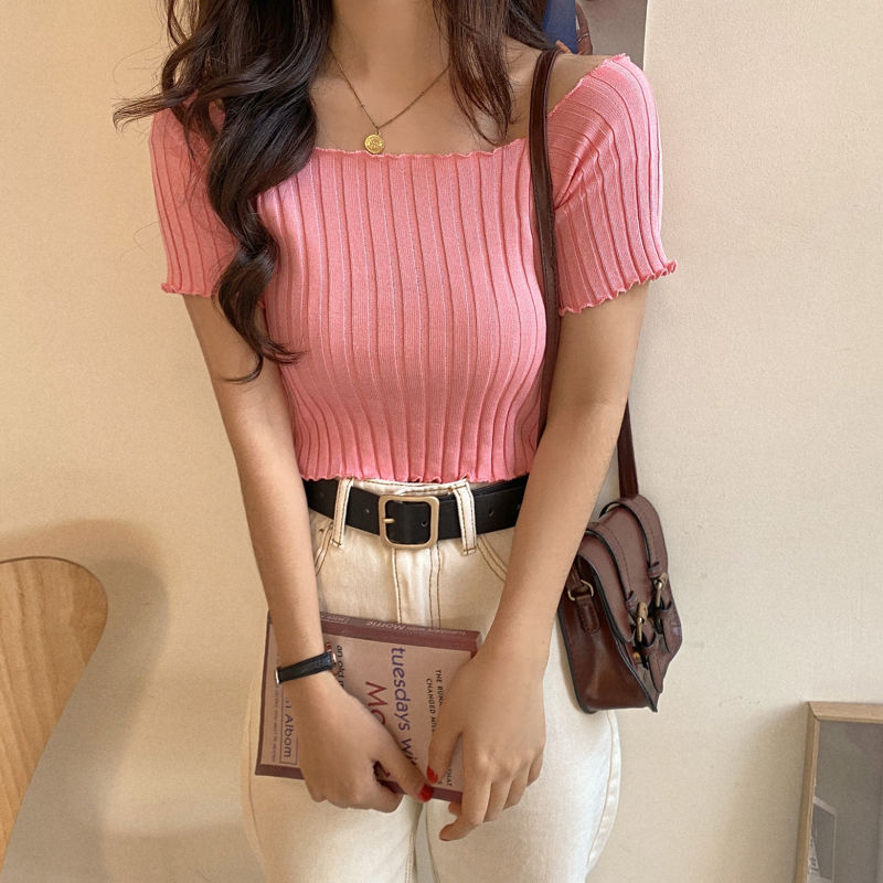 2025년 여름 새로운 스타일의 작은 짧은 기획 쇄골 슬리밍 탑 얇은 스퀘어 넥 반팔 니트 티셔츠 여성용스토어 가기