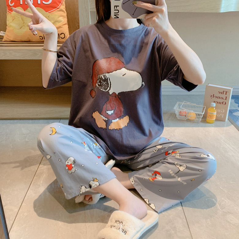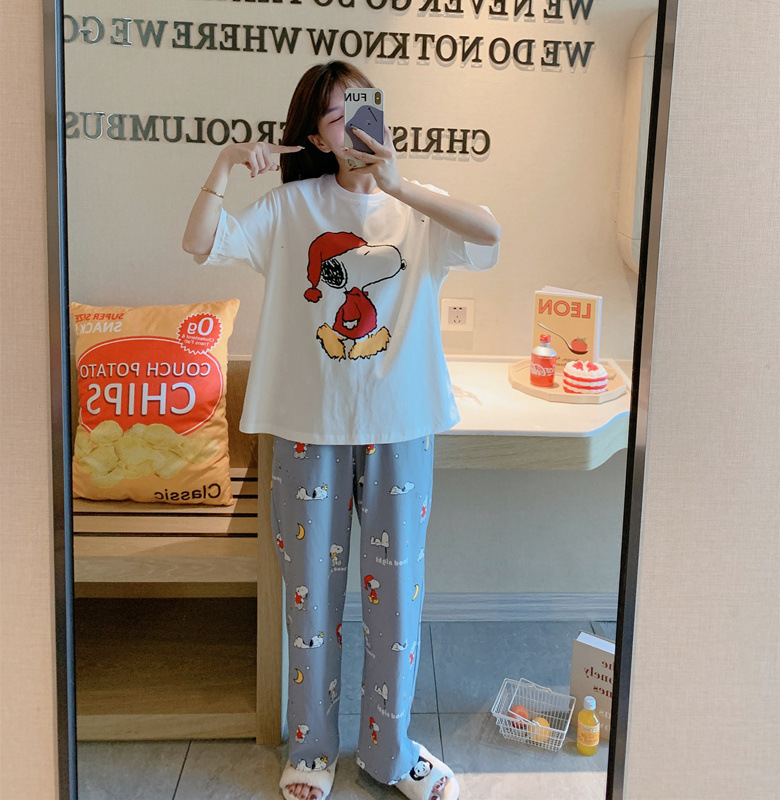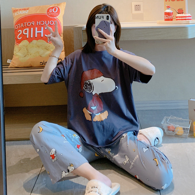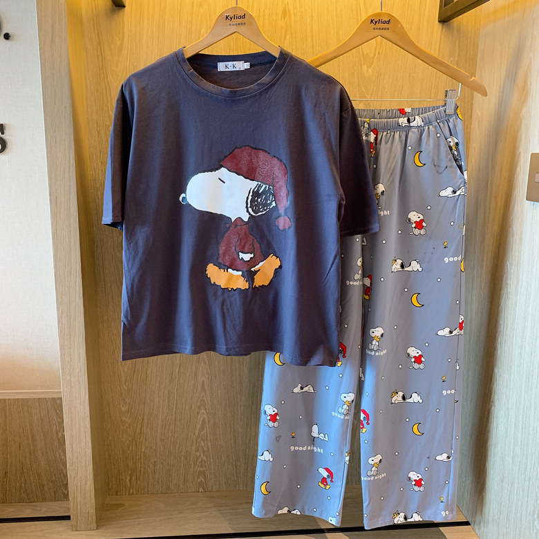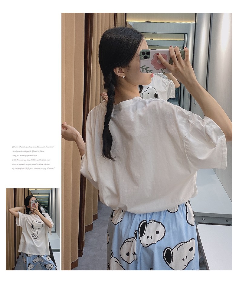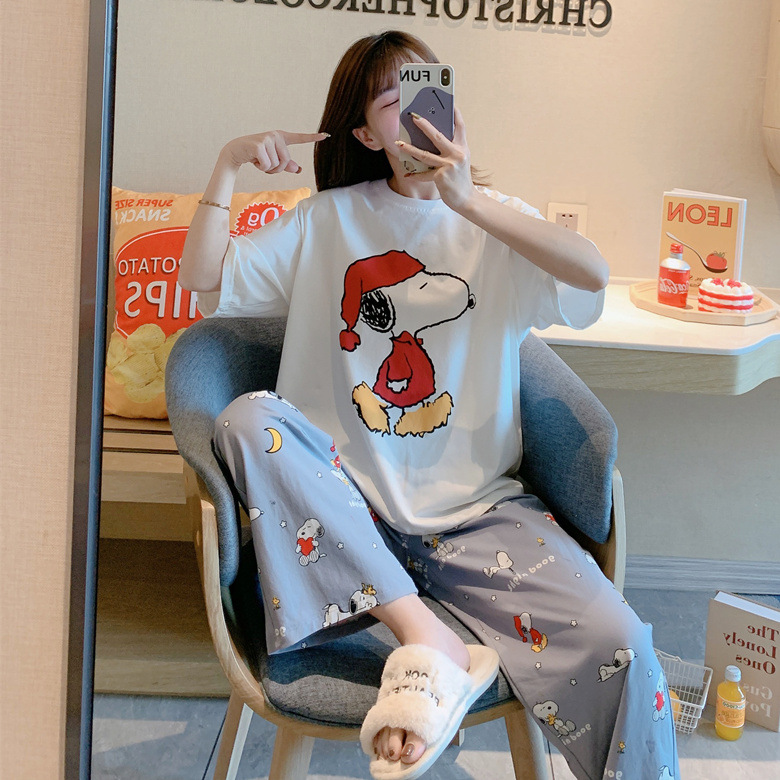 여름 한국 스타일 파자마 여성용 반팔 바지 캐주얼 얇은 커플 만화 스누피 느슨한 가정복 세트스토어 가기