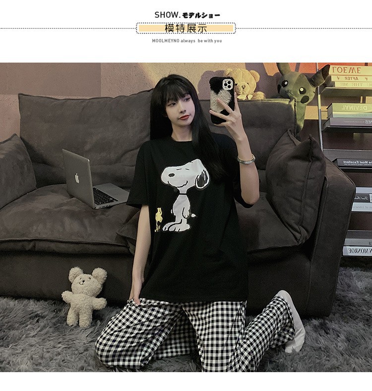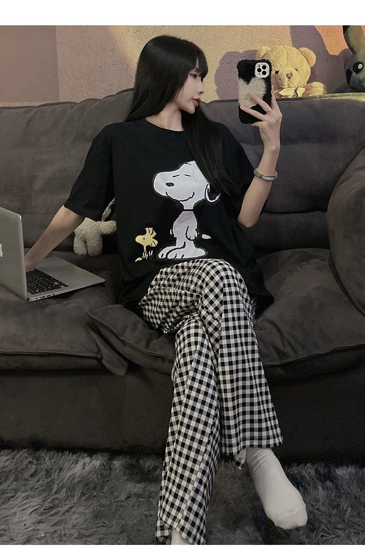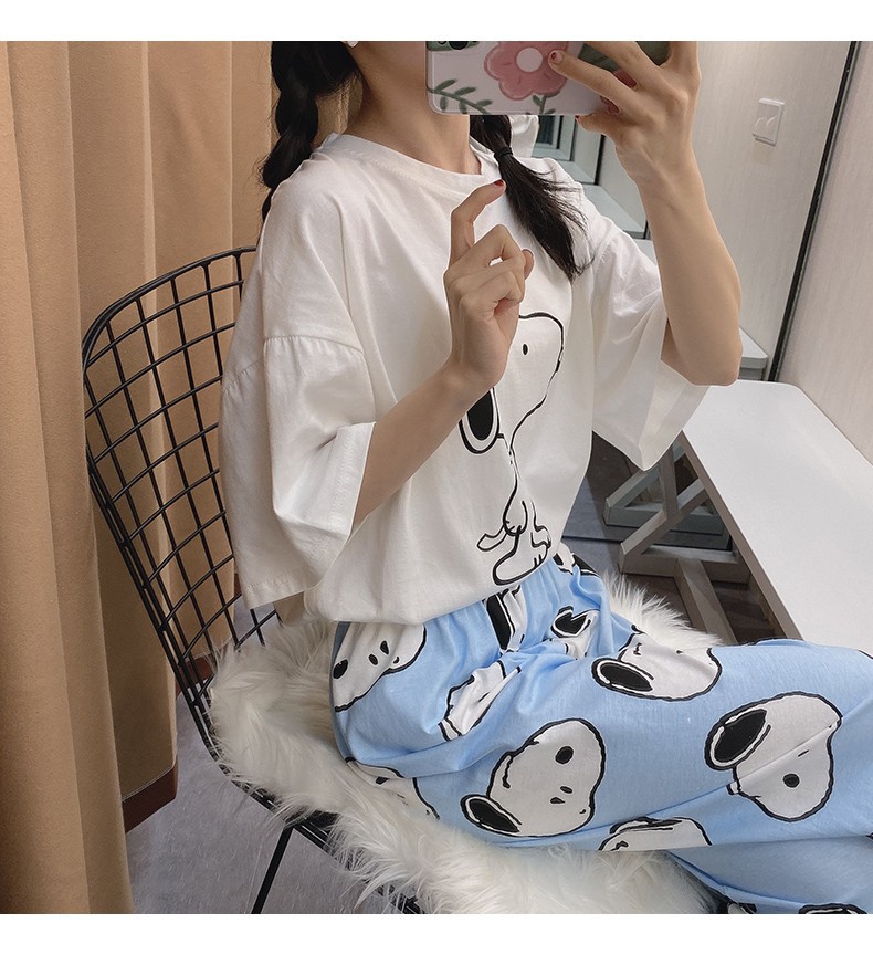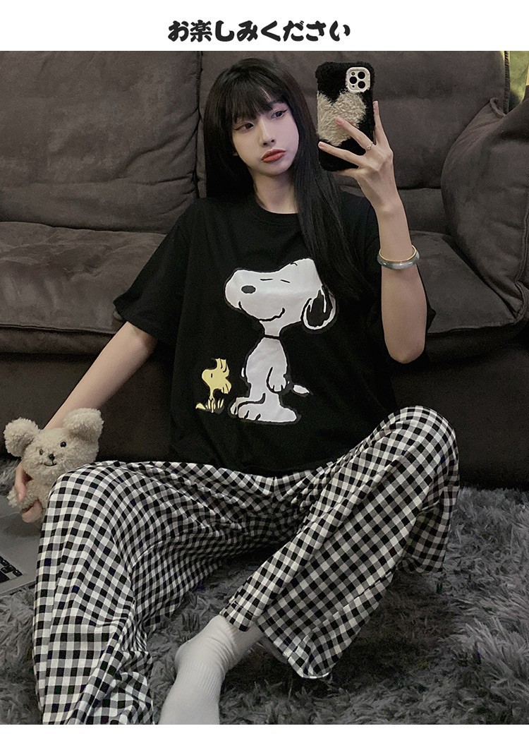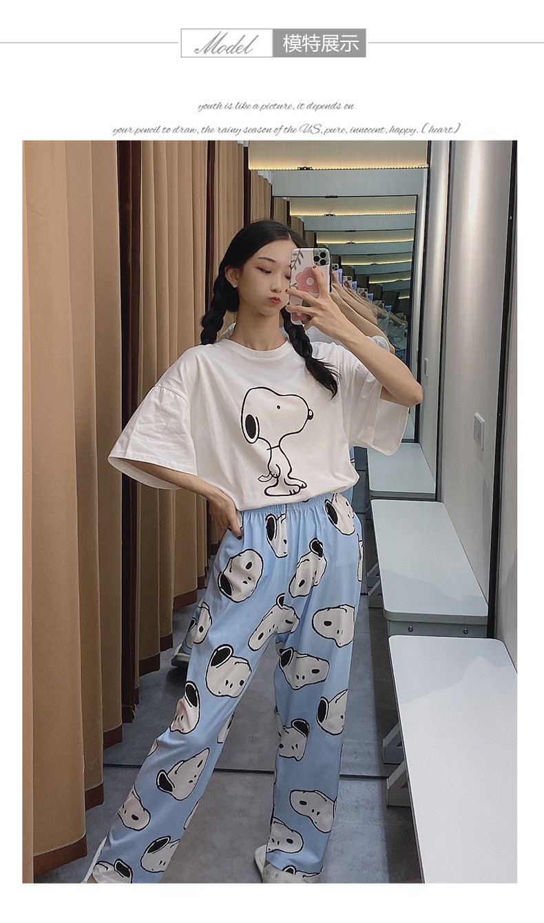 여름 한국 스타일 파자마 여성용 반팔 바지 캐주얼 얇은 커플 만화 스누피 느슨한 가정복 세트스토어 가기