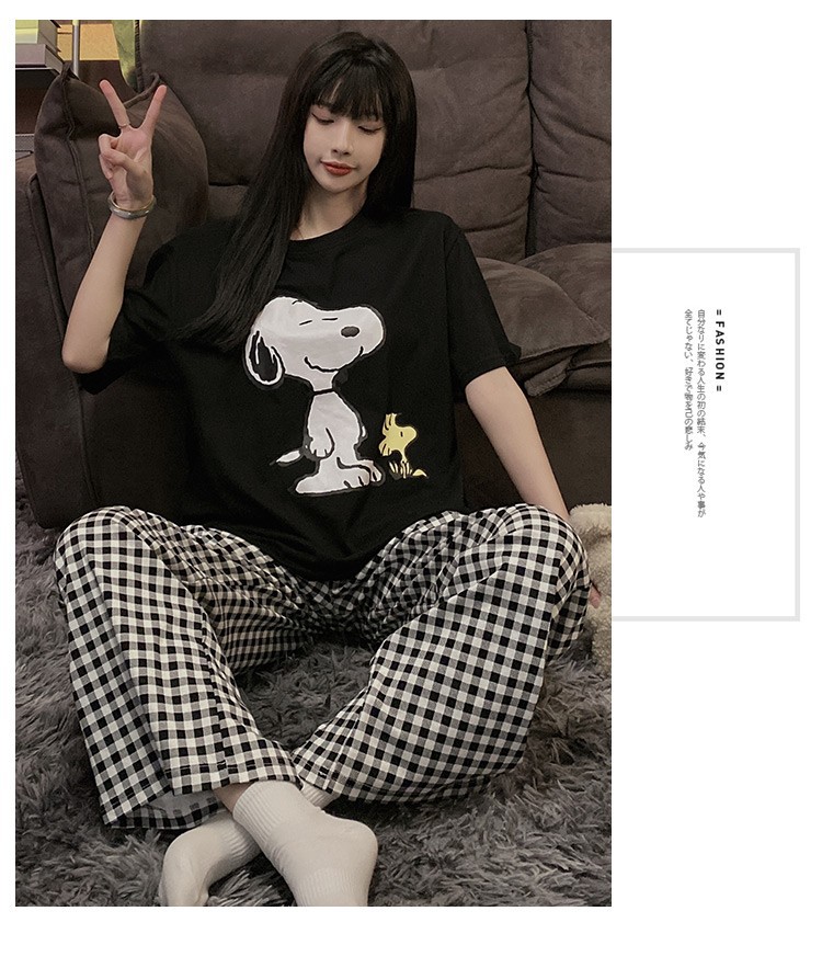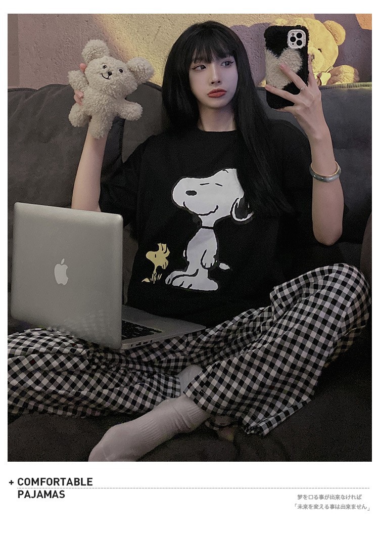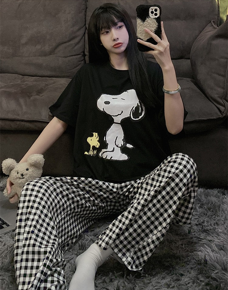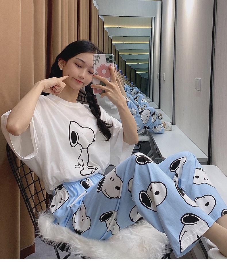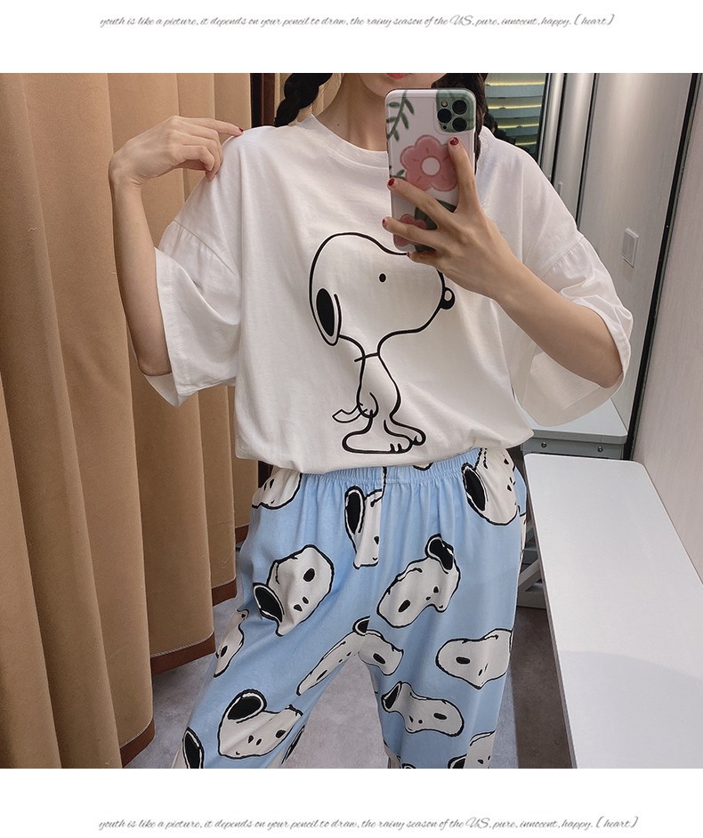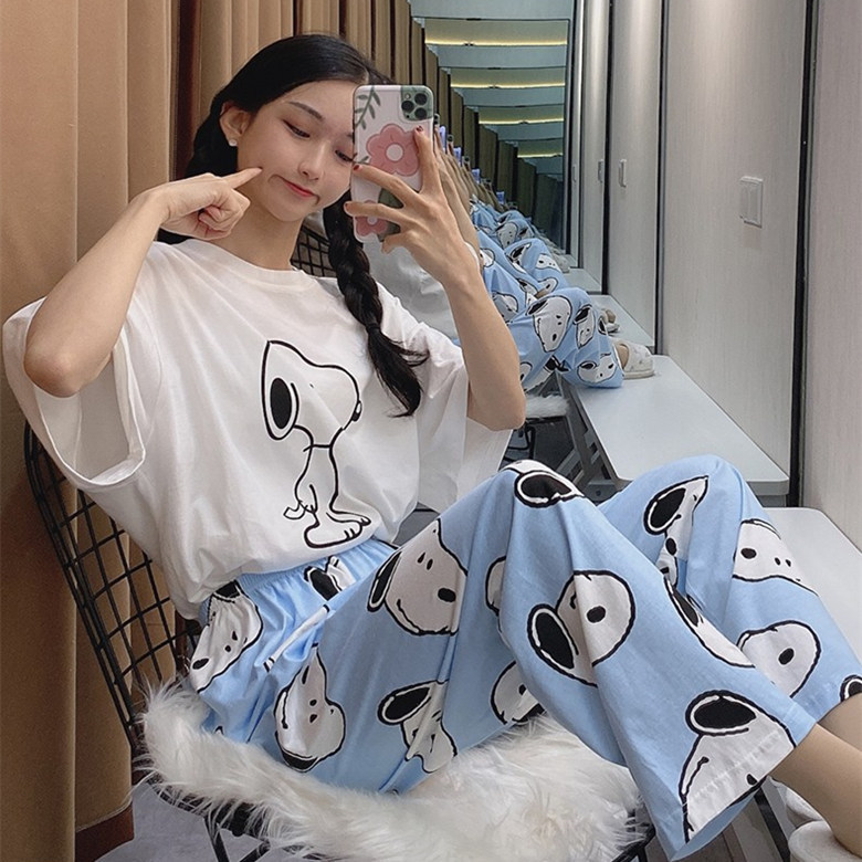 여름 한국 스타일 파자마 여성용 반팔 바지 캐주얼 얇은 커플 만화 스누피 느슨한 가정복 세트