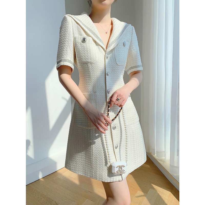 YT1818 시크 라이트 럭셔리 고급 샤넬 스타일 화이트 세트 원피스 네이비 칼라 원피스 여성의 여름 틈새 디자인스토어 가기