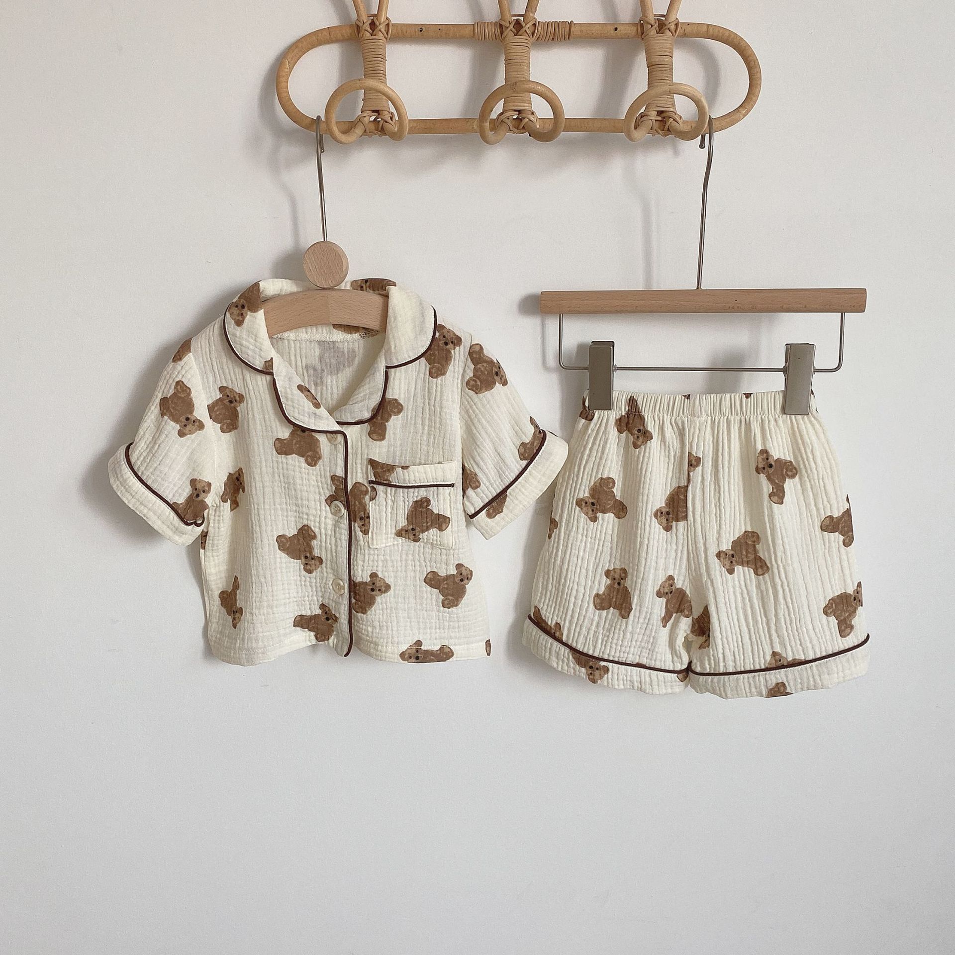 어린이 반팔 잠옷 소년과 소녀를위한 곰 인쇄 면사 싱글 브레스트 반바지 가정복 면 세트