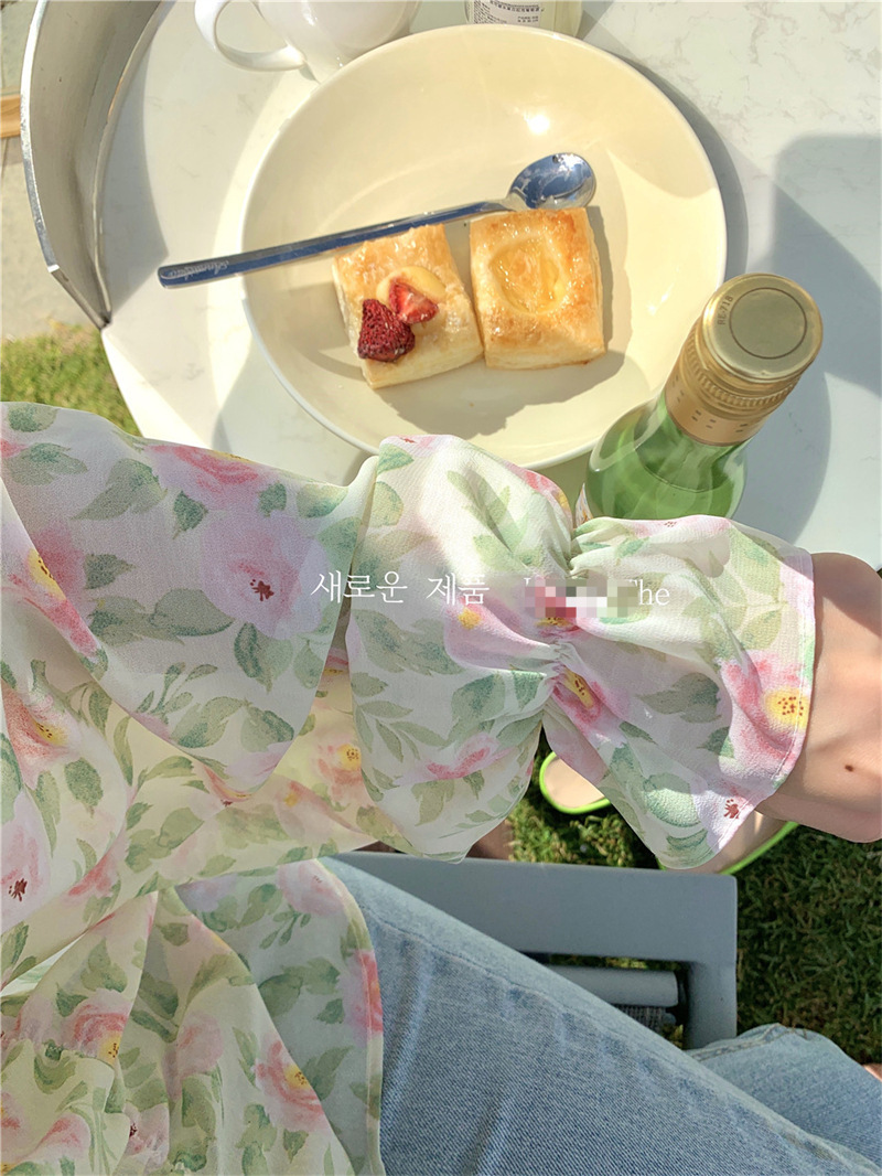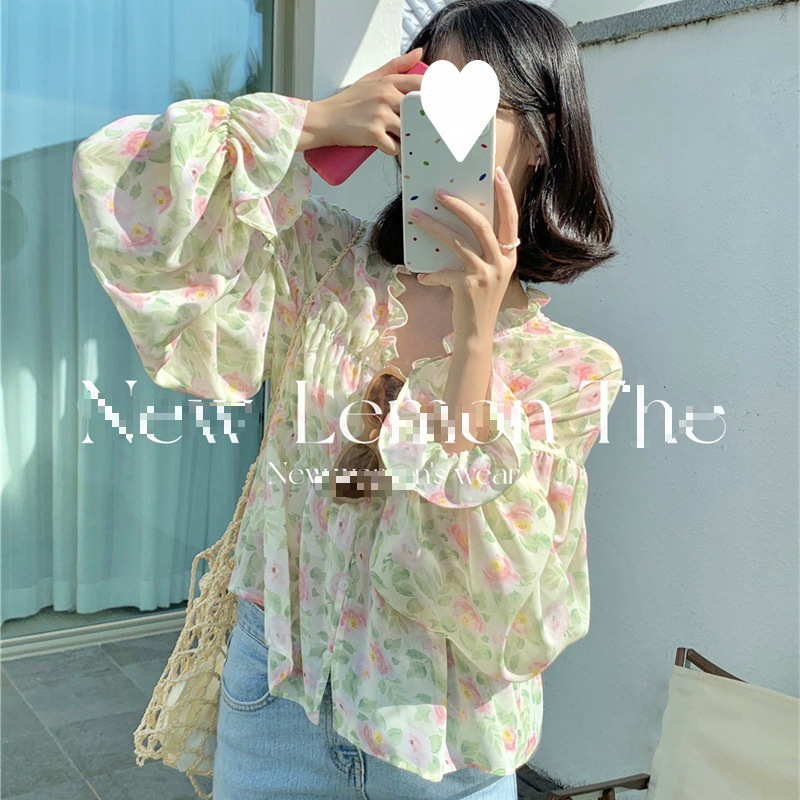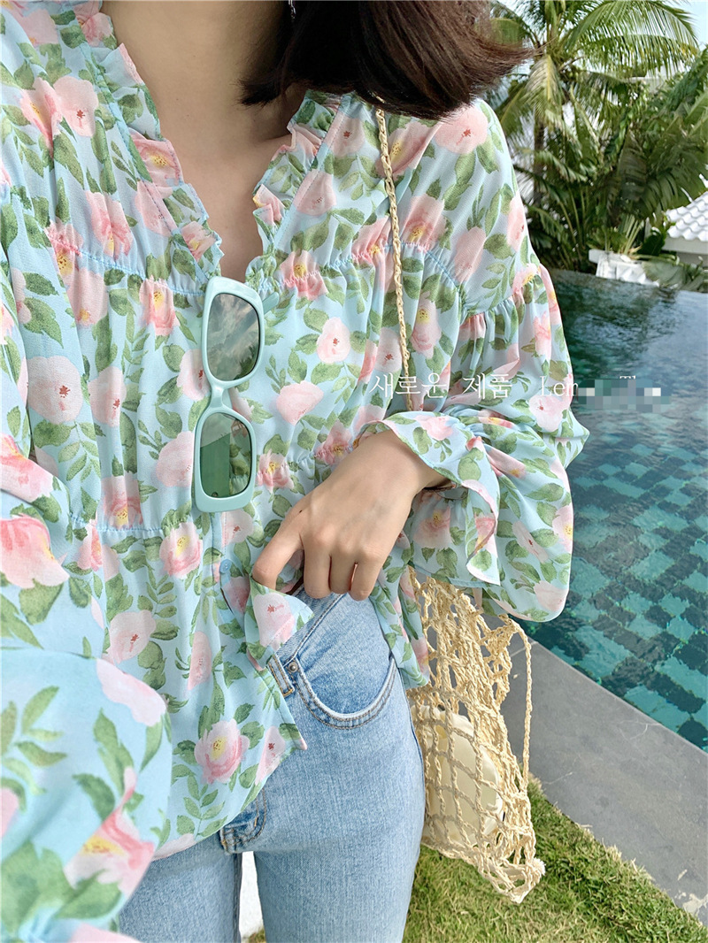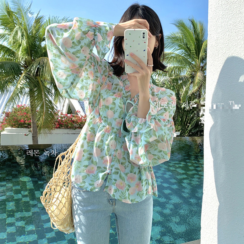 여성용 레트로 꽃무늬 셔츠 봄 2025 브이넥 얇은 허리 긴팔 탑 살짝 비치는 피부 친화적인 쉬폰 셔츠스토어 가기