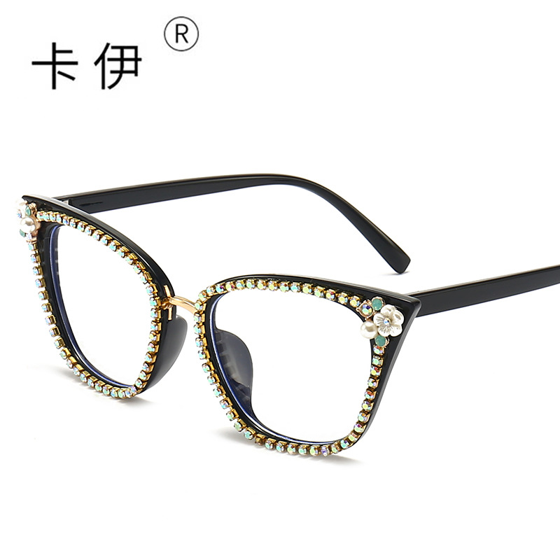 새로운 다이아몬드 패션 선글라스 유럽과 미국 고양이 눈 다이아몬드 남성과 여성은 평면 안경 공 장식 선글라스를 착용