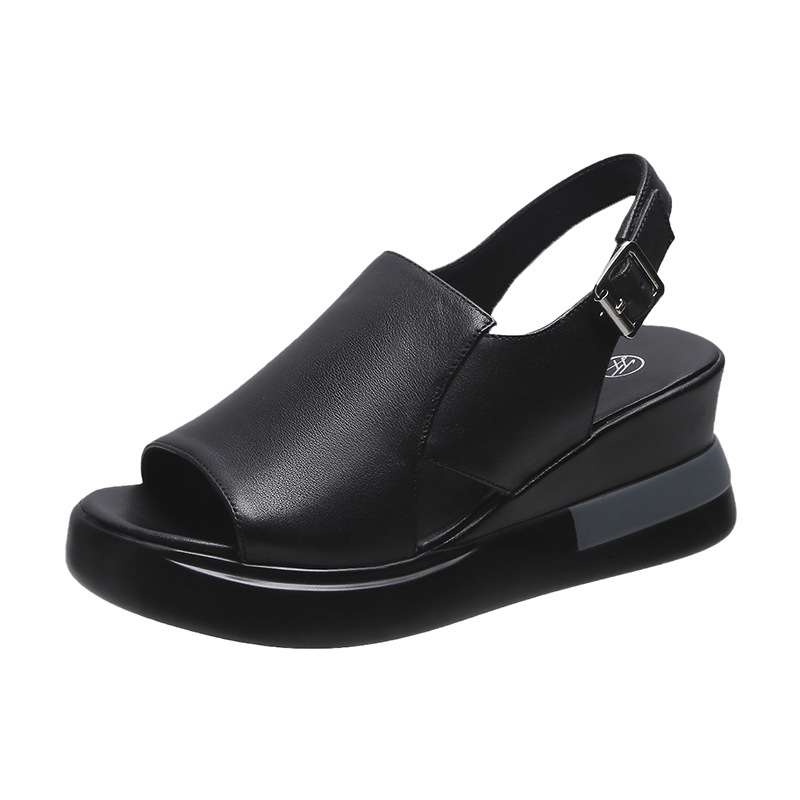 2021 새로운 여름 두꺼운 밑창 웨지 가죽 샌들 여성용 세련된 후면 빈 부드러운 가죽 피쉬 머스 신발 높이 증가 플랫폼 신발