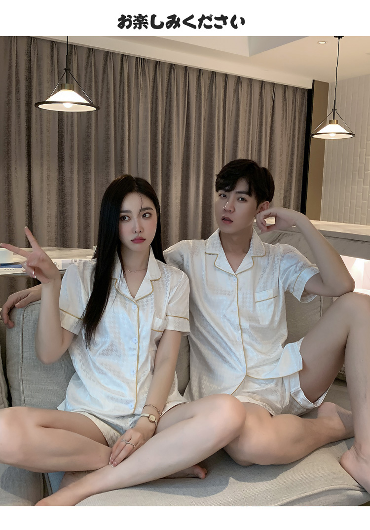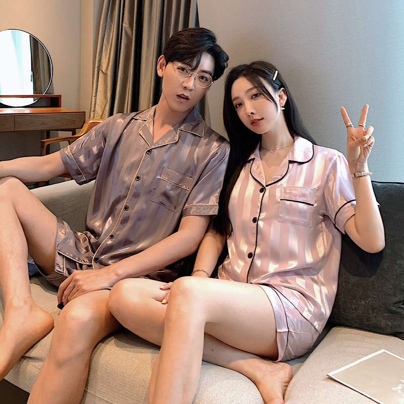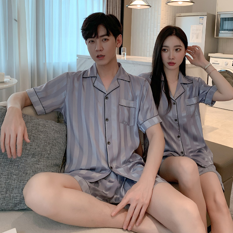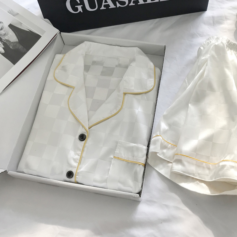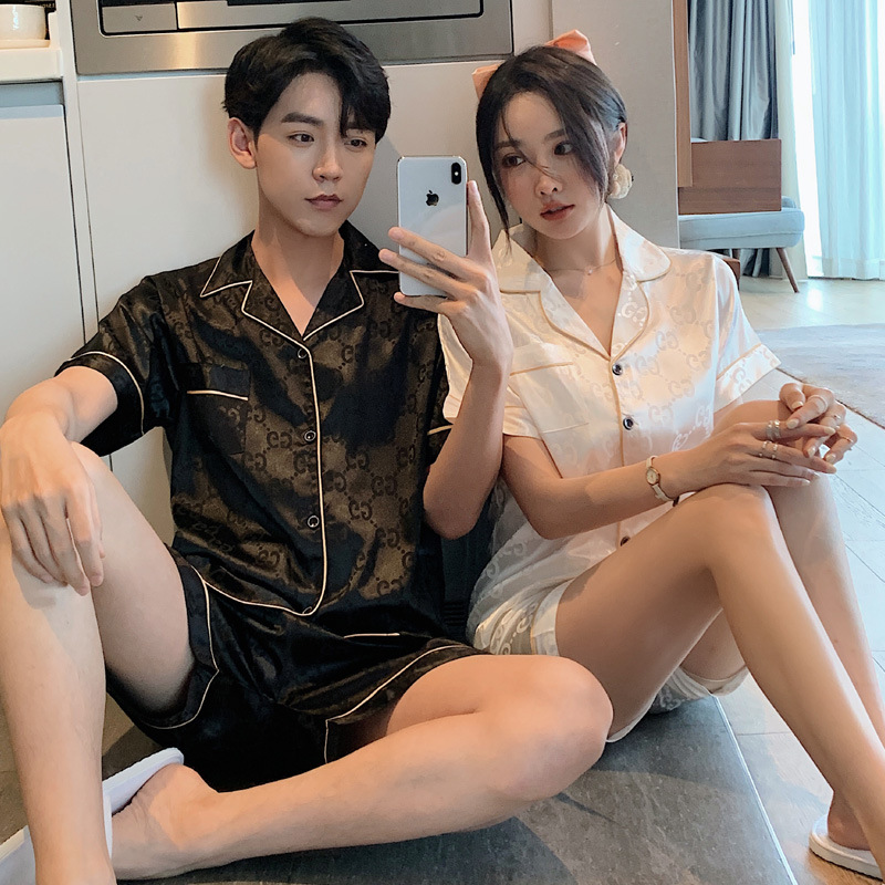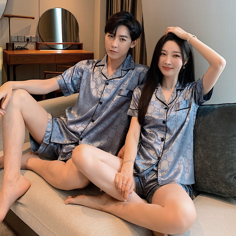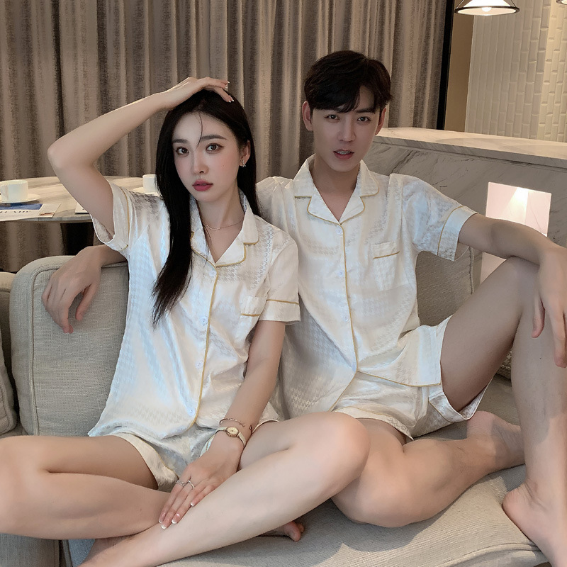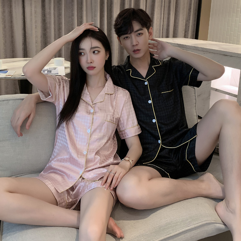 커플 잠옷 여자의 여름 하늘 얼음 실크 얇은 반팔 실크 고급 Houndstooth 가정 의류 남자의 세트