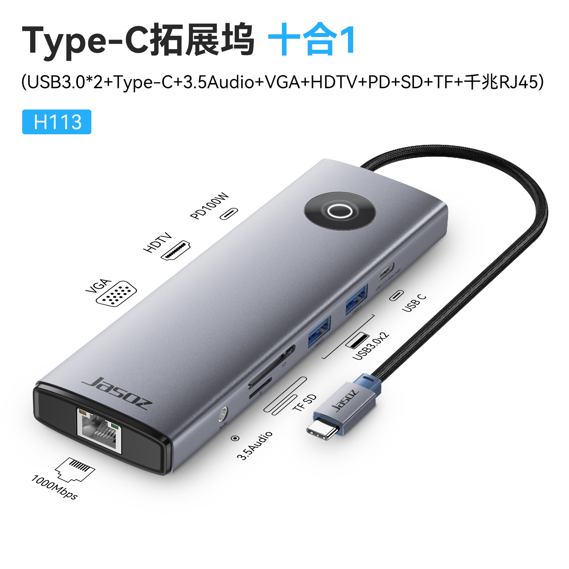 • H113 Type-C 확장 도크 10 in 1 USB3.0 * 3 + 3.5AV + VGA + HDMI + PD + SD + TF
