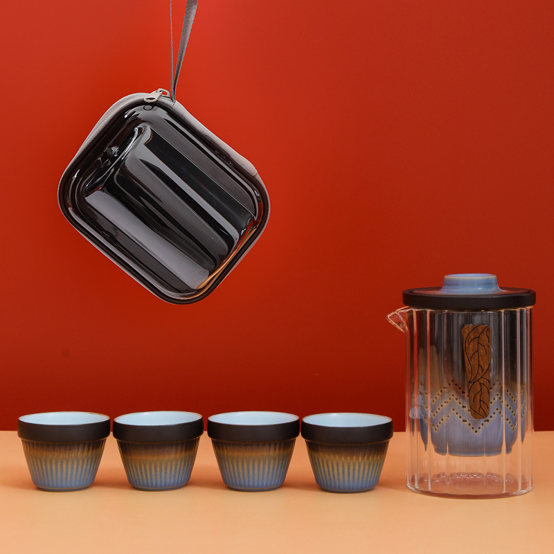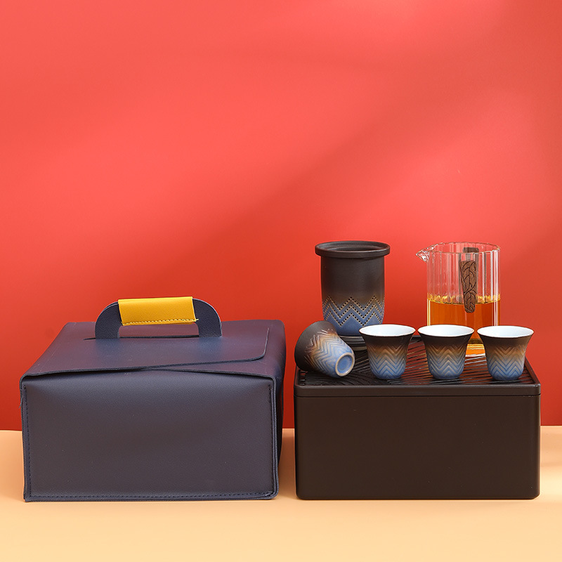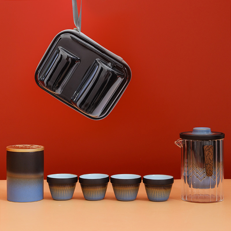 • 그라디언트 블루와 블랙 여행 차 세트 + 찻주전자 + 여행 가방