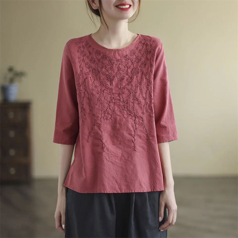 2025 봄 여름 신상 문예 레트로 면마 솔리드 컬러 반팔 티셔츠 여성용 중공예 자수 꽃무늬 루즈핏 라운드넥 탑