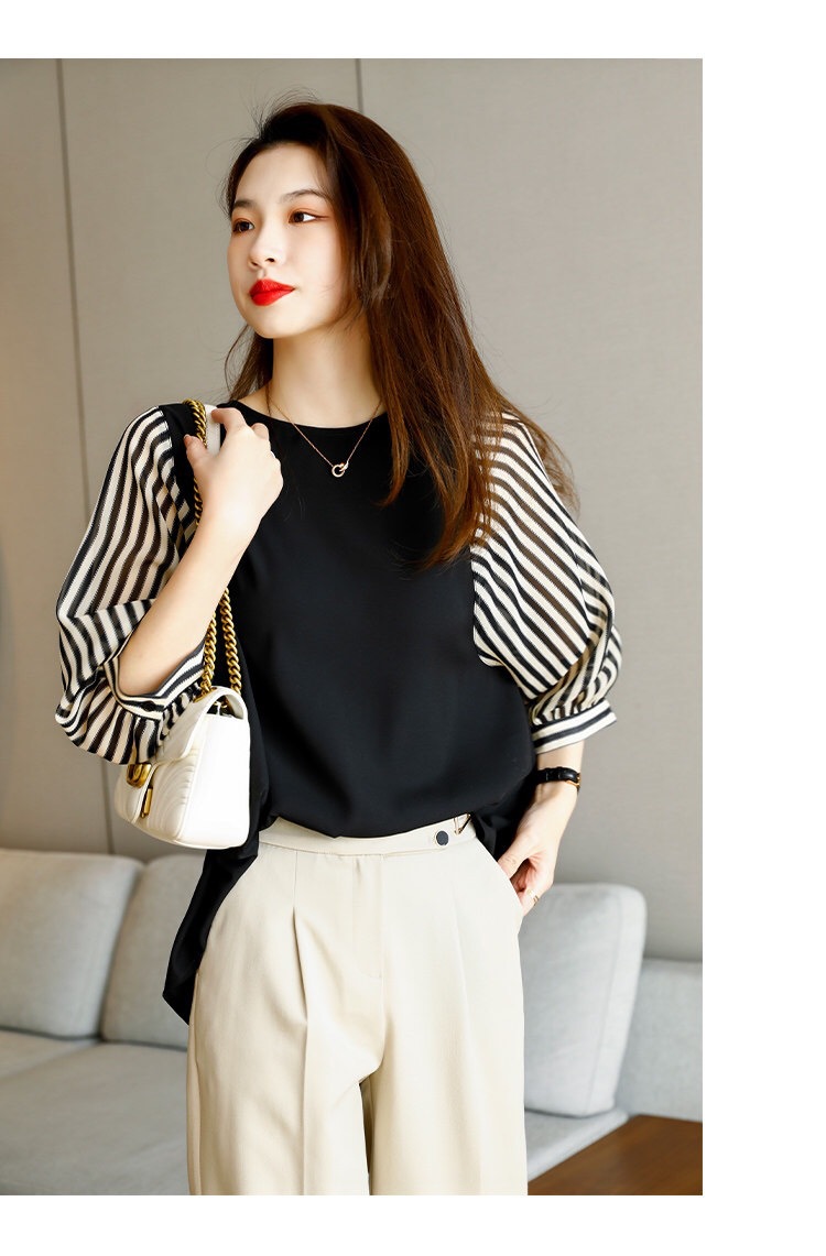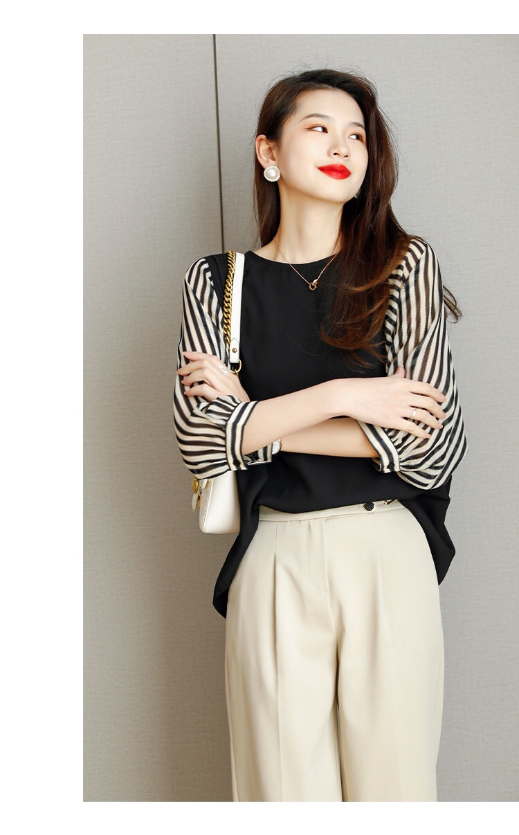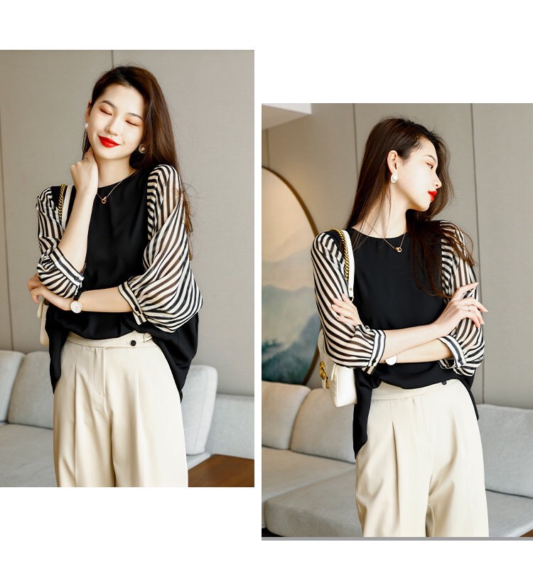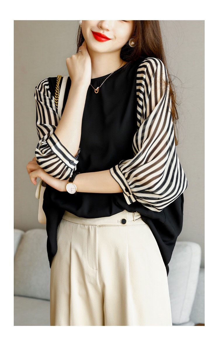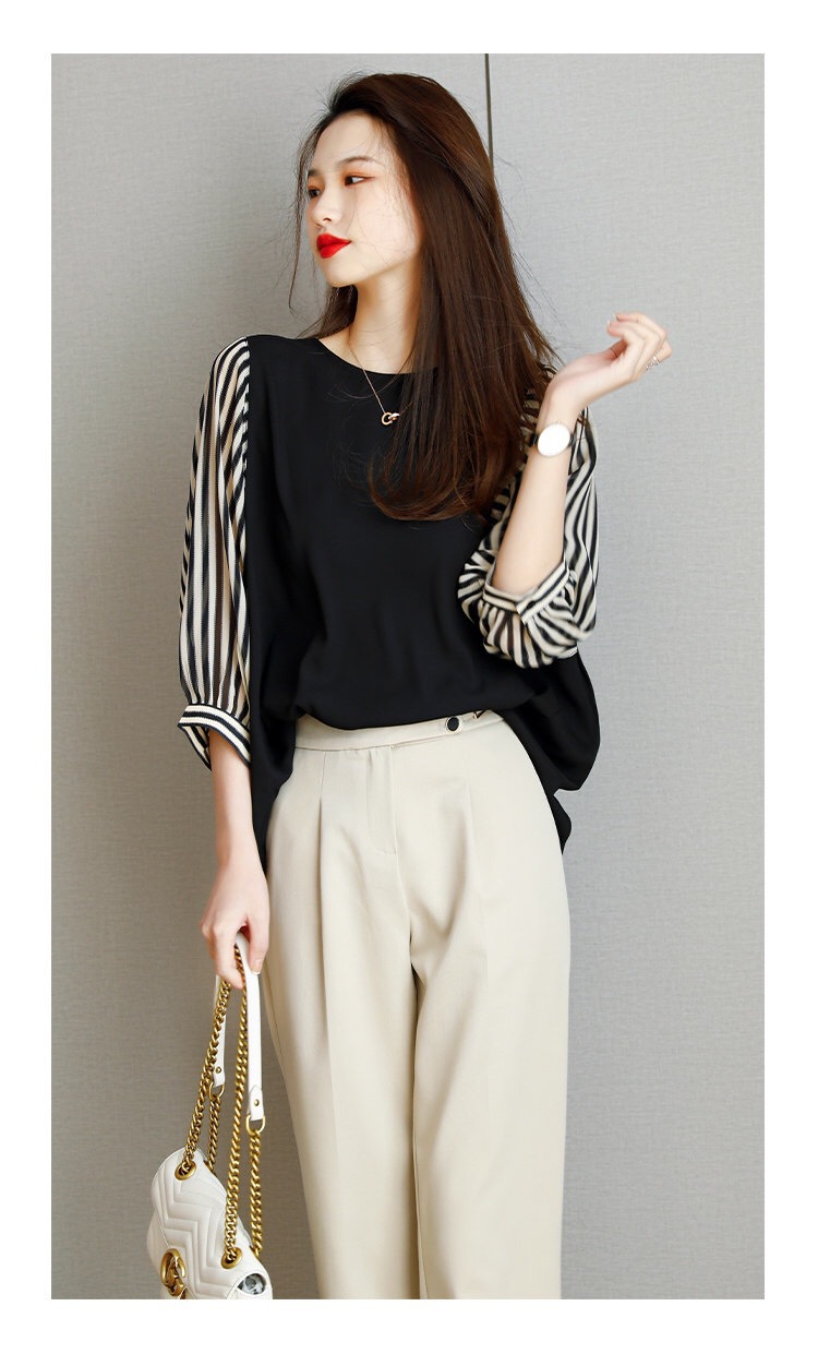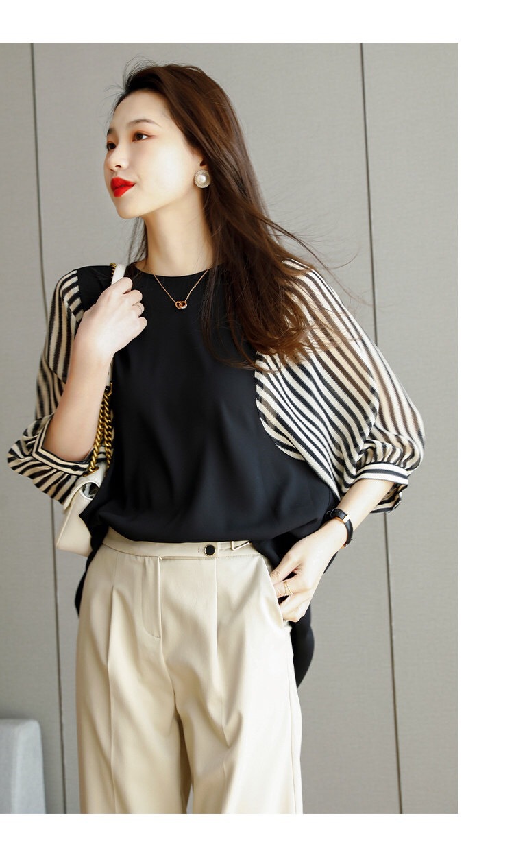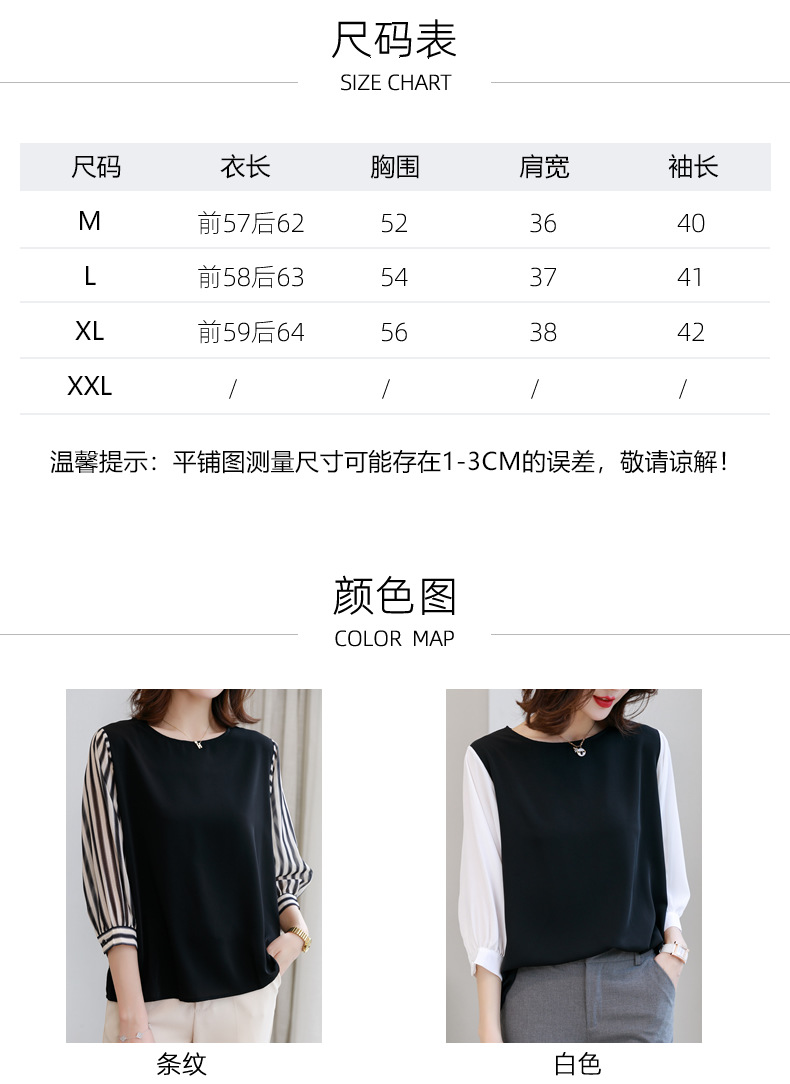 대조 색상 스티칭 박쥐 슬리브 쉬폰 탑 여성용 2022 새로운 패션 느슨한 풀오버 라운드 넥 우아한 중간 소매 셔츠