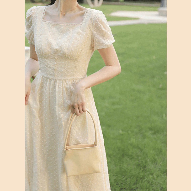 2022 새로운 프랑스 스타일 복고풍 긴 원피스 부드러운 스타일 원피스 고급 스퀘어 칼라 퍼프 슬리브 원피스 여성 여름스토어 가기