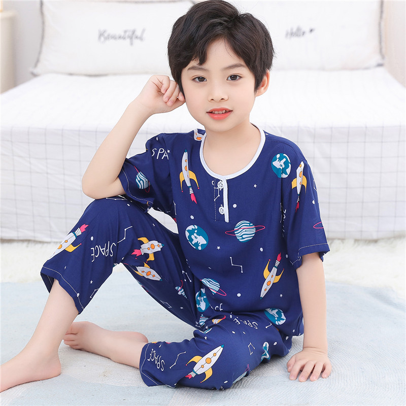 여름 소녀 면 실크 어린이 얇은 가정 옷 큰 소년 반팔 바지 면 실크 중형 및 대형 어린이 에어컨 의류 세트