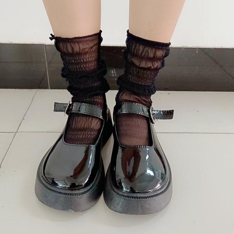 줄무늬 탄성 중간 송아지 양말 블랙 화이트 살구색 스타킹 초박형 여름 주름 레트로 일본 귀여운 여성 양말