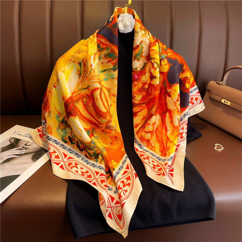 유화 스타일 스카프 여성용 90cm 대형 사각 스카프 트울 실크 스카프 숄 이중 사용 봄과 여름 여행 자외선 차단제 스카프스토어 가기