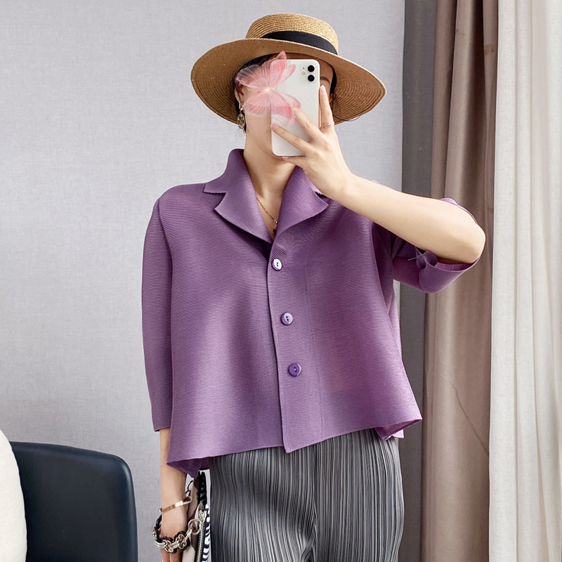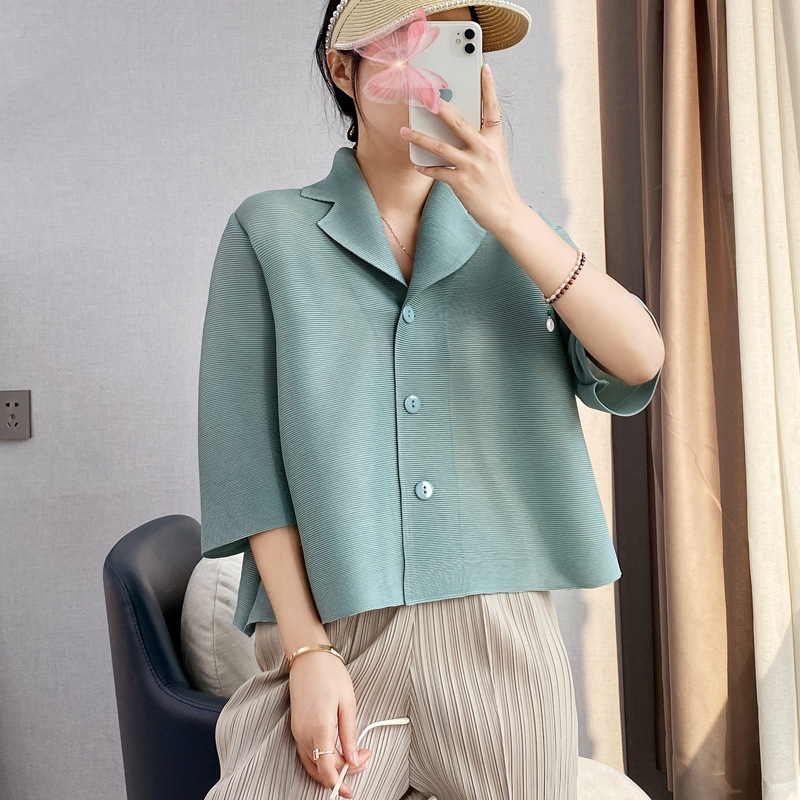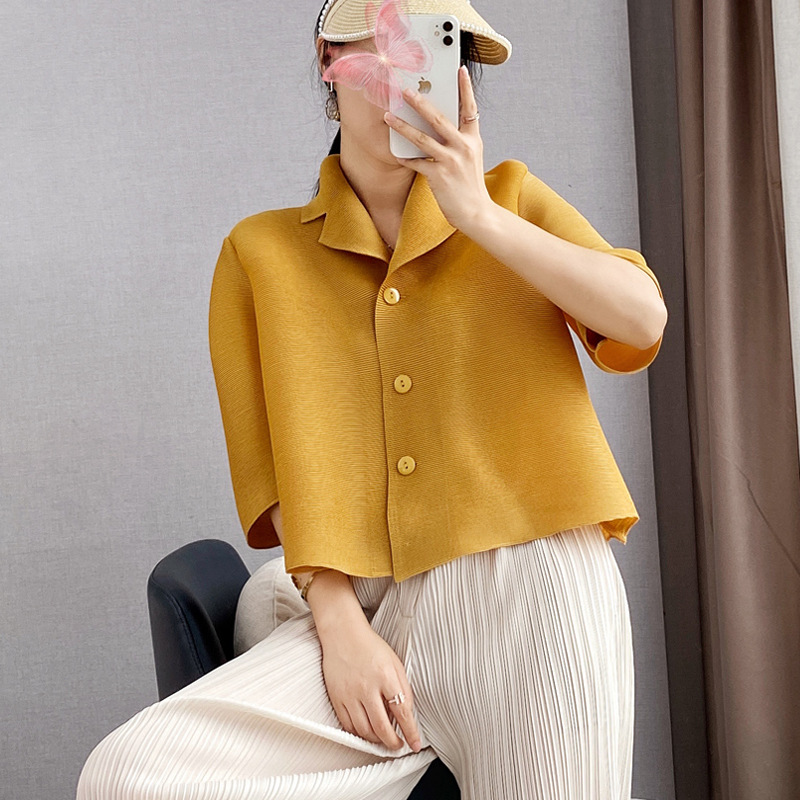 미야케 치쿄 플리츠 탑 여성용 여름 반팔 플러스 사이즈 아우터 가디건 샤넬 스타일 짧은 재킷 슬리밍 셔츠 여성용
