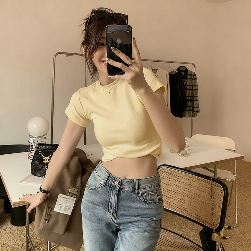 캔디 컬러 한국어 라운드 넥 탑 여성 2025 느슨한 모든 경기 Bottoming 셔츠 여름 새로운 짧은 소매 티셔츠 여성 도매스토어 가기