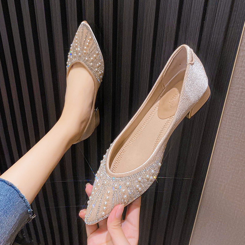 뾰족한 발가락 신발 여성의 봄과 가을 2022 새로운 플랫 힐 얕은 입 라인 석 진주 요정 스타일 사계절 부드러운 밑창 편안한 숙녀 신발