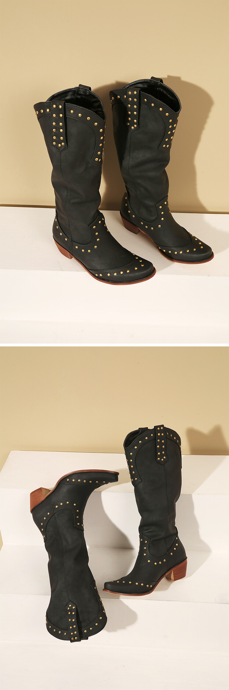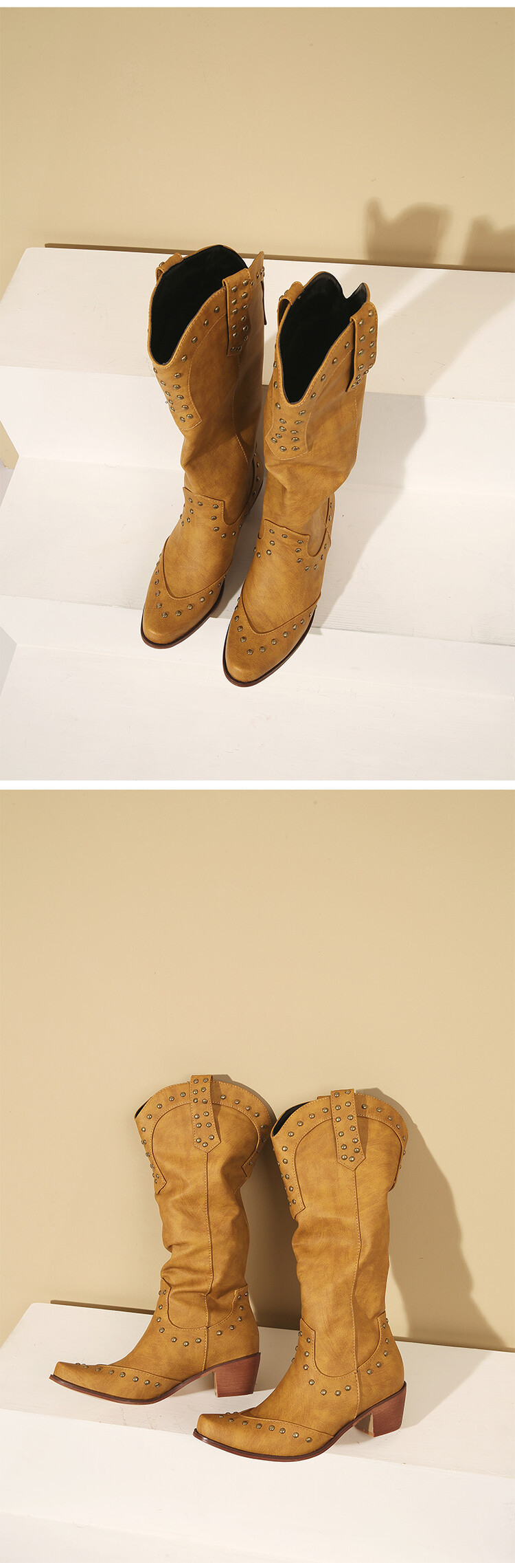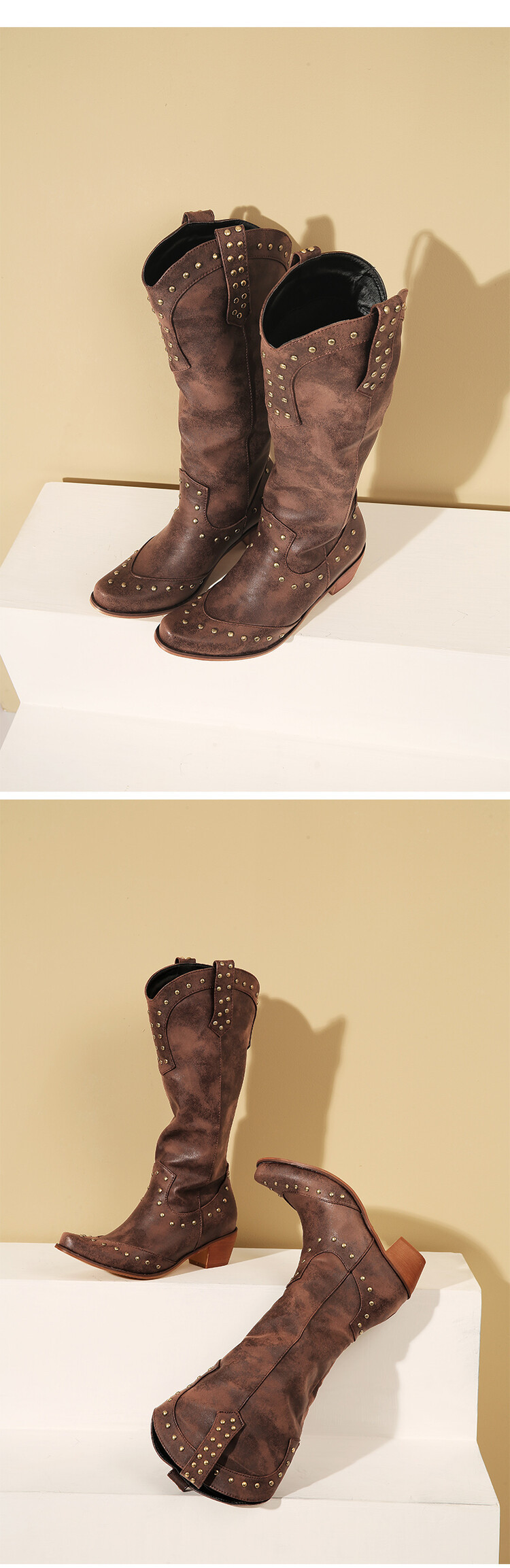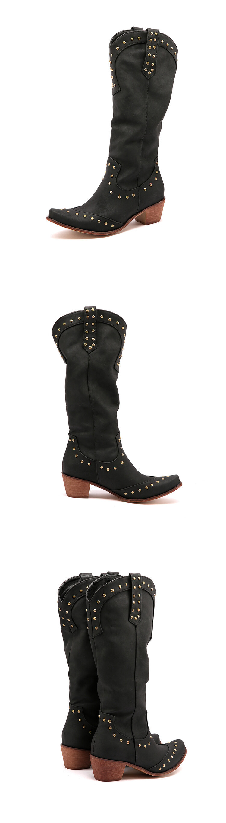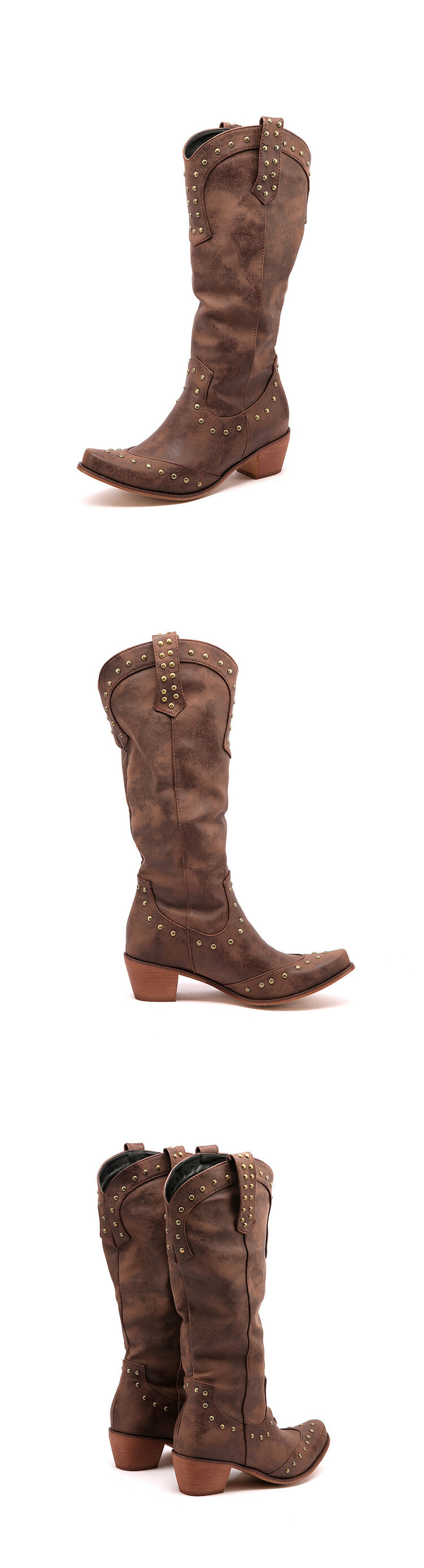 40-45 유럽 및 미국 대외 무역 크로스 보더 메탈 리벳 스퀘어 헤드 하이힐 여성용 하이 부츠 롱 부츠 웨스턴 카우보이 부츠 W874스토어 가기
