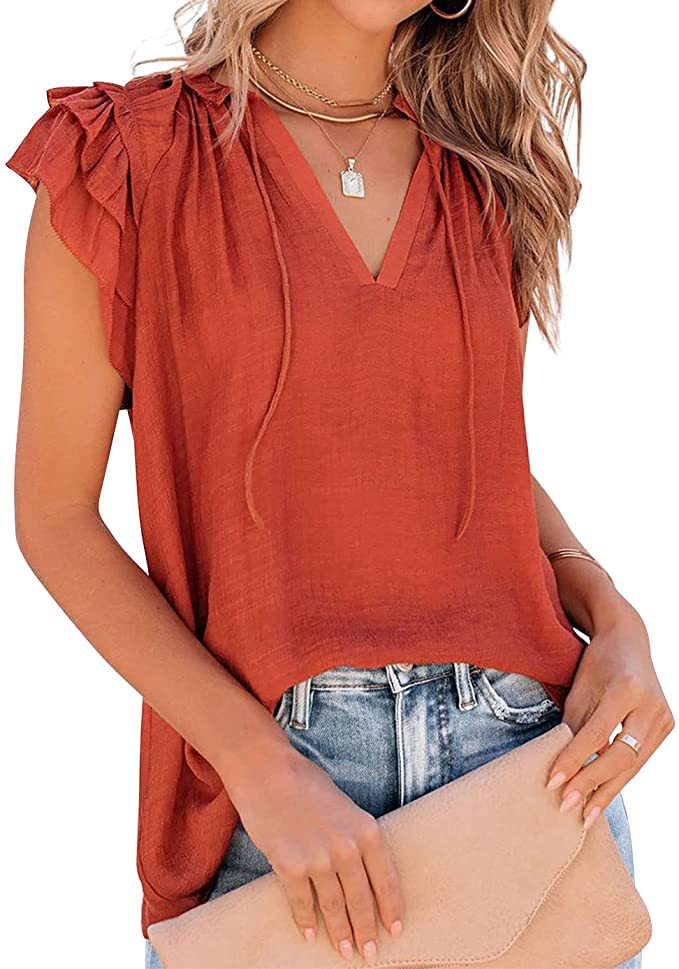아마존 여성의 여름 느슨한 단색 캐주얼 주름 반팔 셔츠 V 넥 느슨한 드로 스트링 셔츠 탑