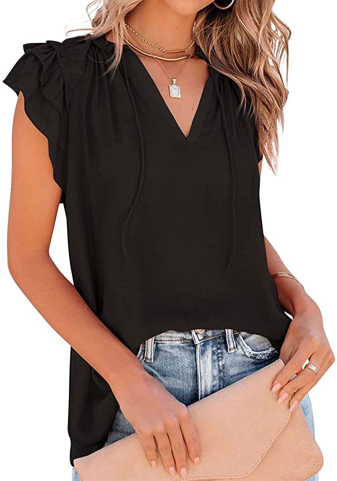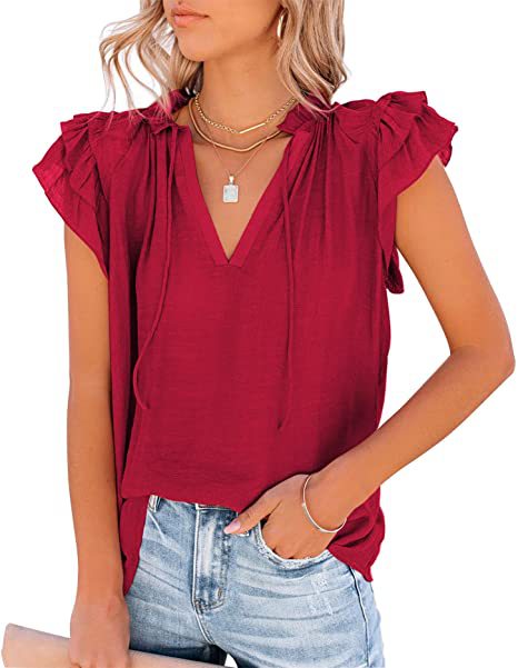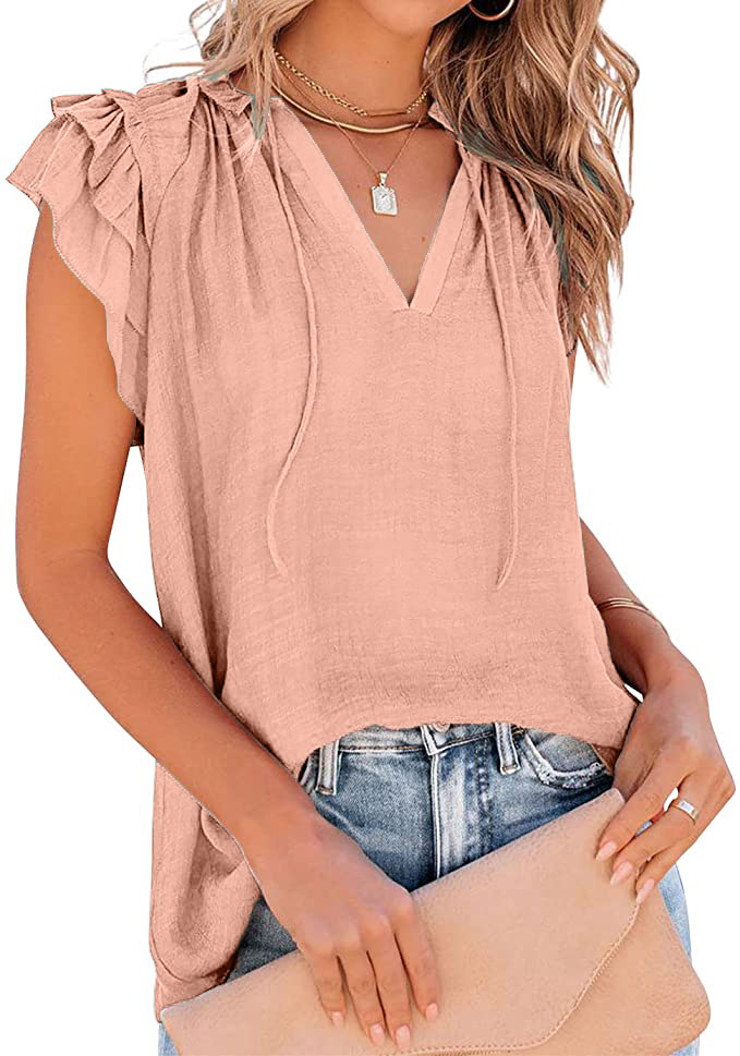 아마존 여성의 여름 느슨한 단색 캐주얼 주름 반팔 셔츠 V 넥 느슨한 드로 스트링 셔츠 탑스토어 가기