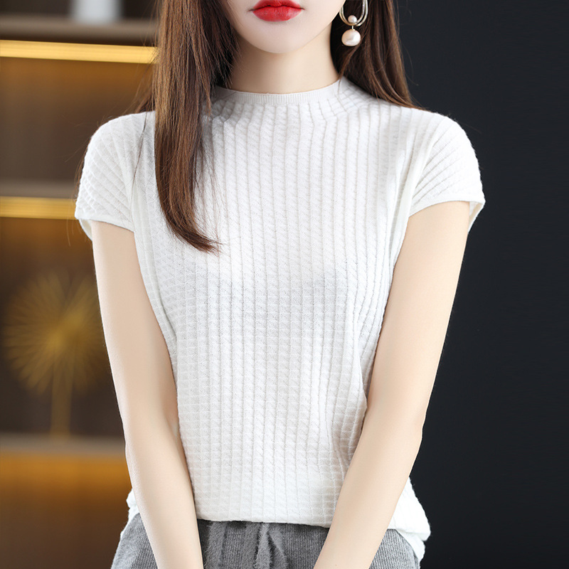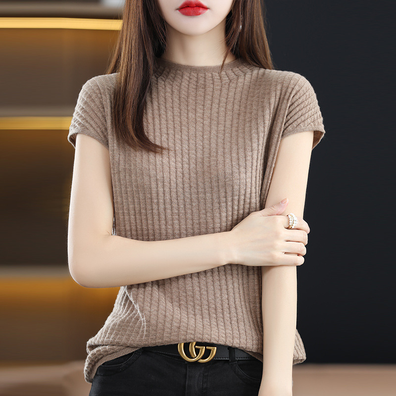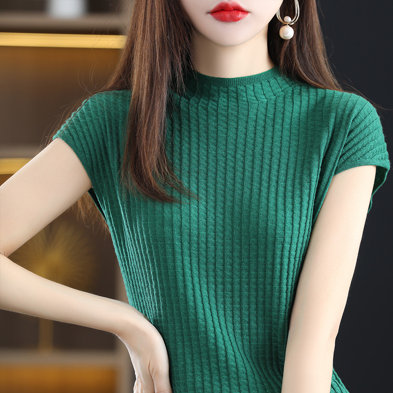 유럽 얇은 하프 하이 칼라 워스티드 울 조끼 여성용 한국식 니트 반팔 티셔츠 탑 민소매 베이스 셔츠