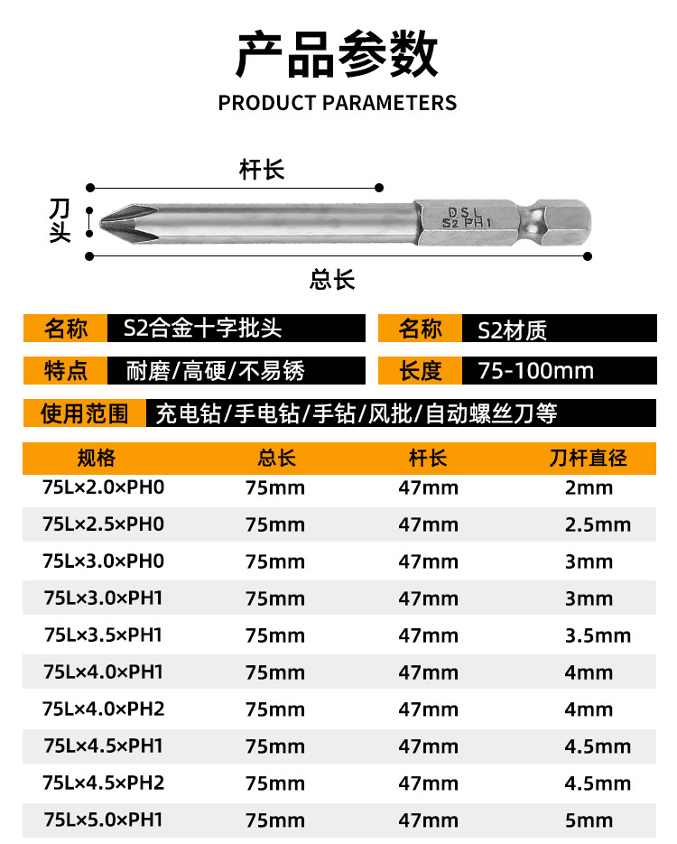 DSL 독일 품질 S2 스틸 중간 긴 크로스 높은 경도 강한 자기 드릴 비트 강한 자기 전기 드라이버 비트