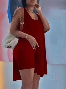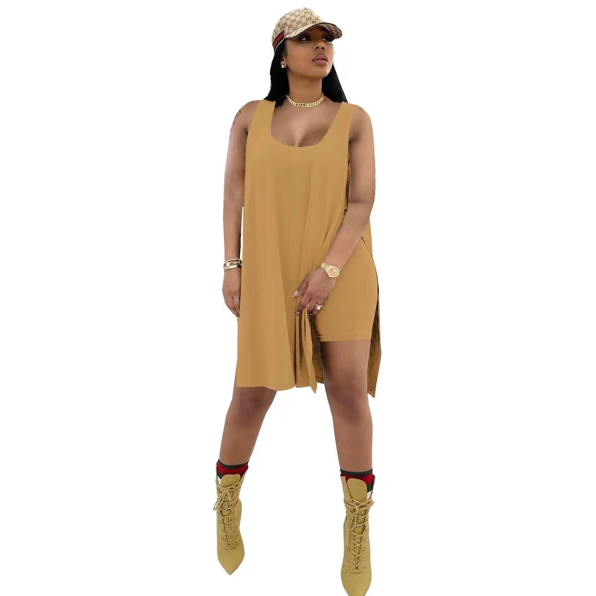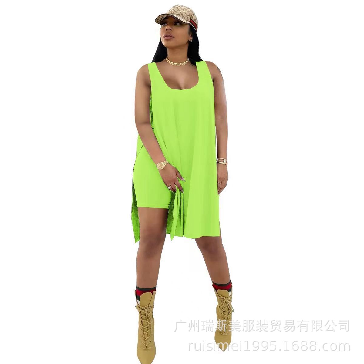 아마존 핫 아이템 2022 여름 조끼 세트 유럽 및 미국 스타일 단색 중간 길이 슬릿 U넥 반바지 유럽 및 미국 인기 상품