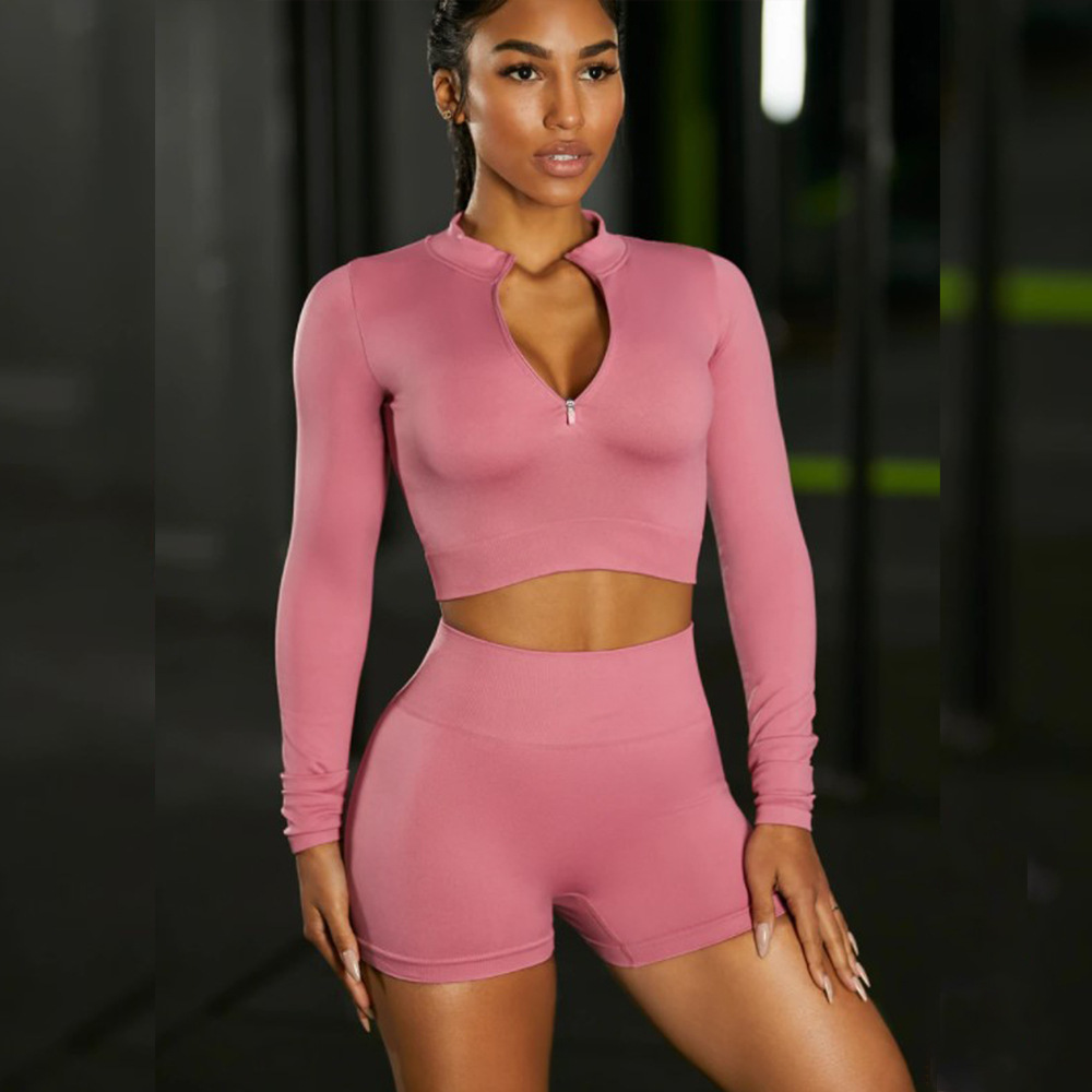 나프탈렌 새로운 크로스 보더 원활한 니트 요가 세트 지퍼 긴 소매 속건 스포츠 피트니스 반바지 세트 여성