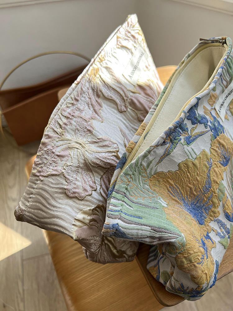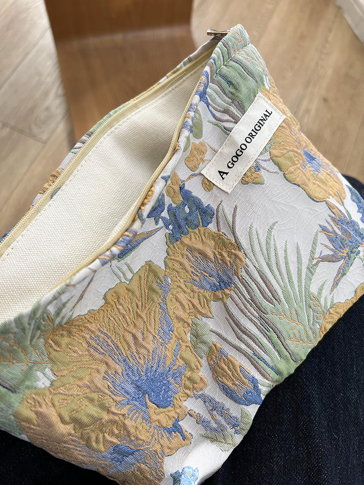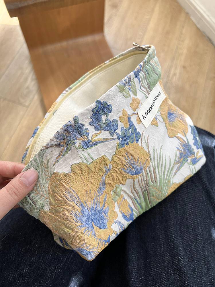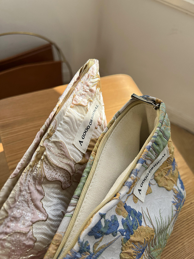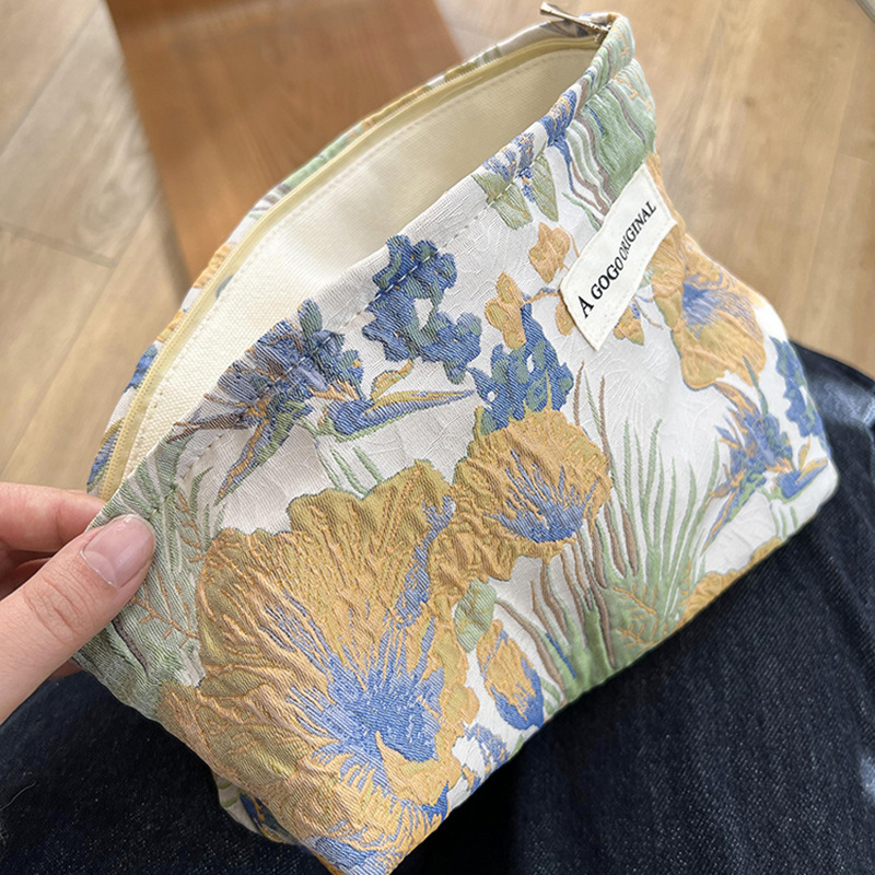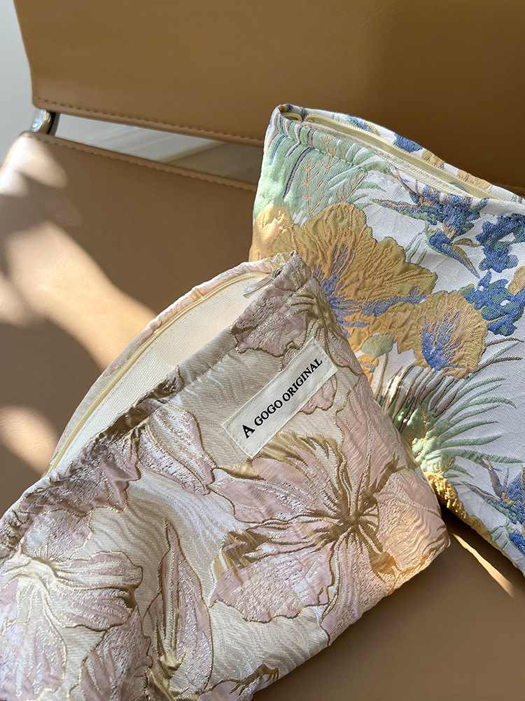 골드 실크 플라워 양각 자카드 화장품 가방 주름 질감 대용량 휴대용 이너 백 스킨 케어 보관 가방스토어 가기