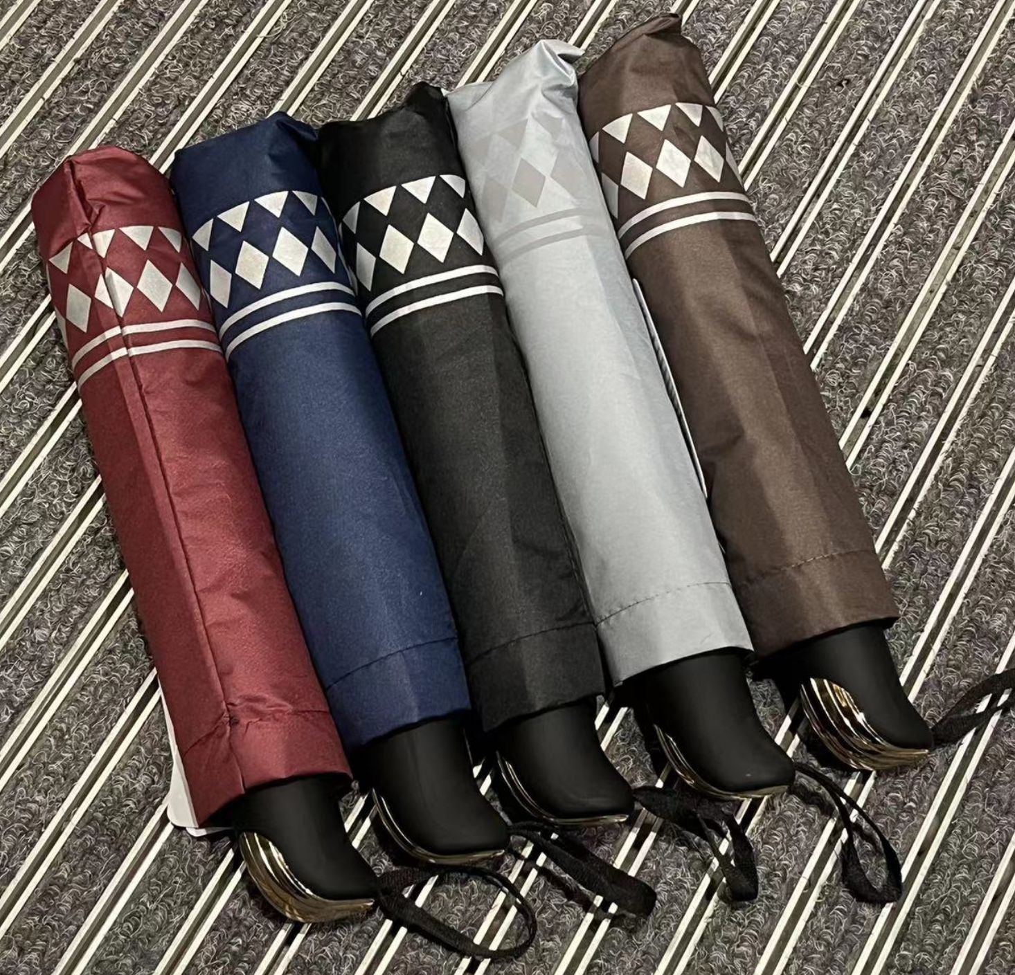 10 본 초대형 블랙 접착제 크리 에이 티브 트라이 폴드 써니 우산 스트라이프 편지 격자 무늬 능직물 사용자 정의 로고 선물 우산스토어 가기