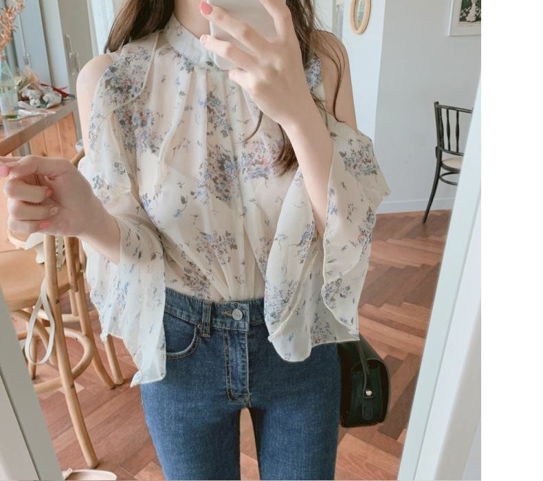 신선한 스타일 쉬폰 꽃 셔츠 여성의 여름 디자인 감각 작은 요정 슈퍼 스위트 오픈 숄더 혼 슬리브 얇은 탑스토어 가기