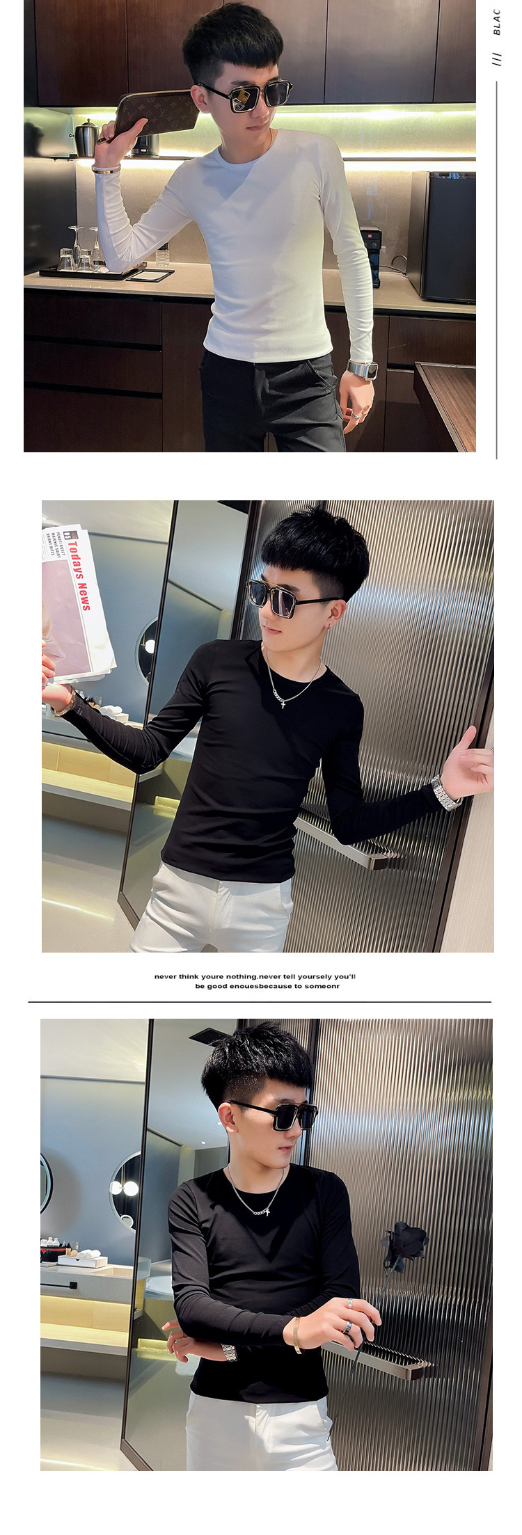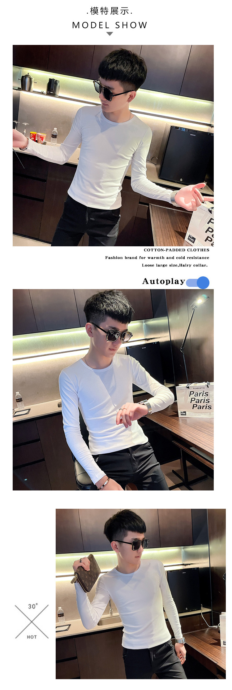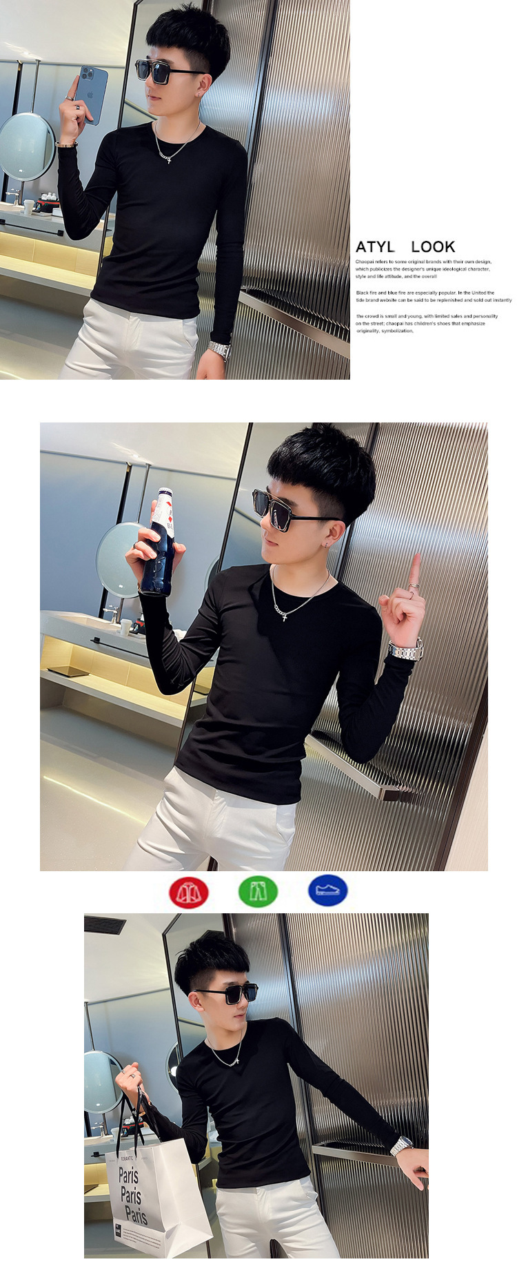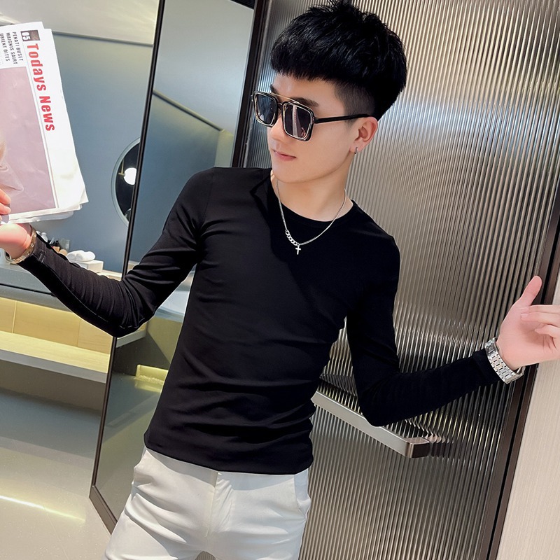 고탄력 타이트 보텀 셔츠 가을과 겨울 밀착 내부 작은 라운드 넥 탑 퓨어 화이트 남성용 긴팔 티셔츠 슬림핏스토어 가기
