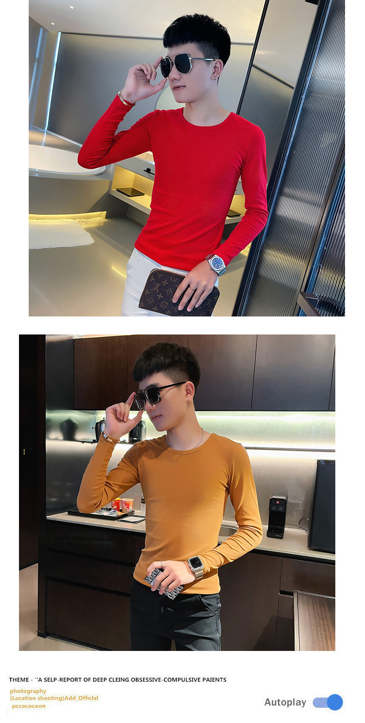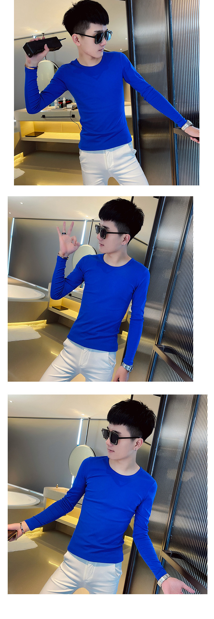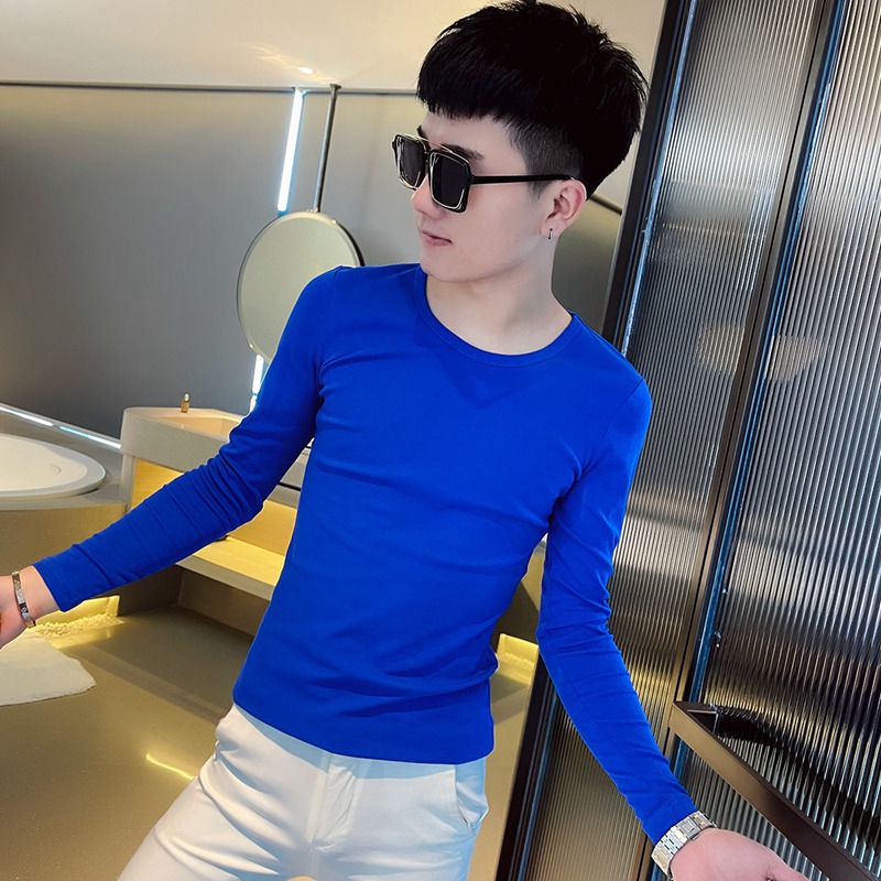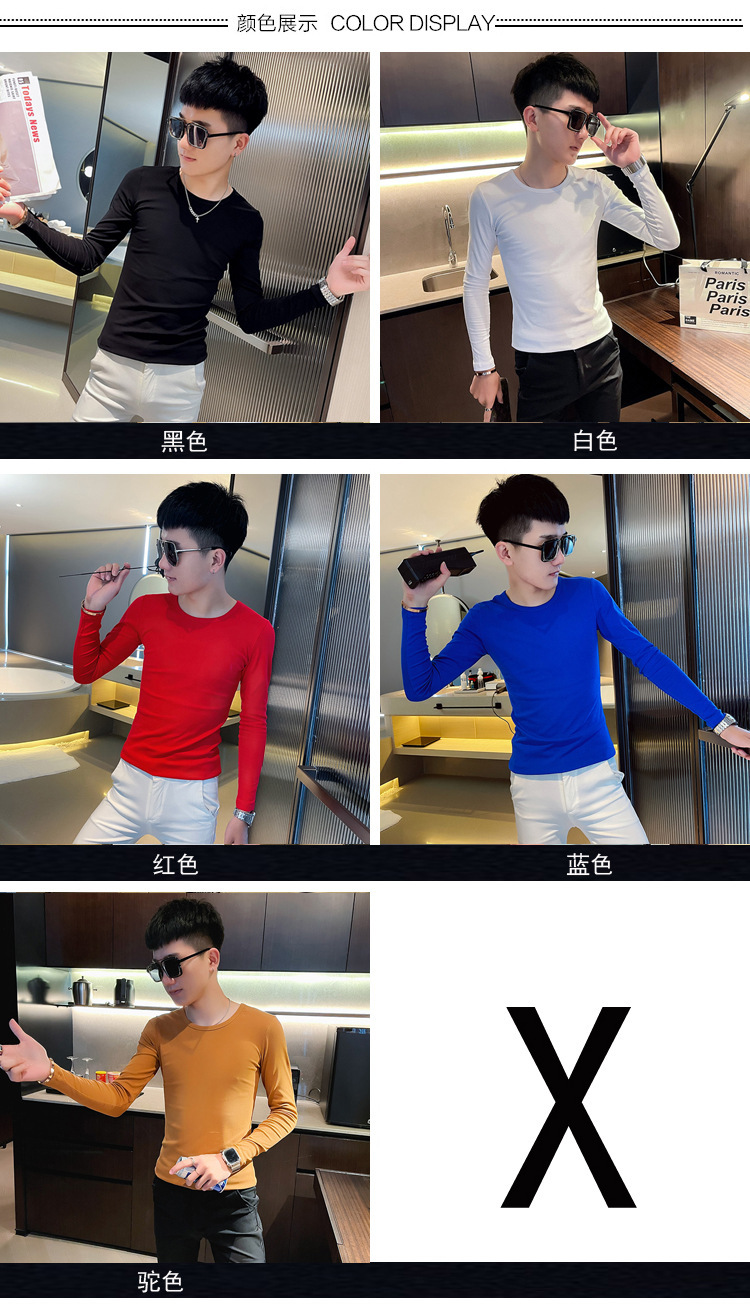 고탄력 타이트 보텀 셔츠 가을과 겨울 밀착 내부 작은 라운드 넥 탑 퓨어 화이트 남성용 긴팔 티셔츠 슬림핏스토어 가기