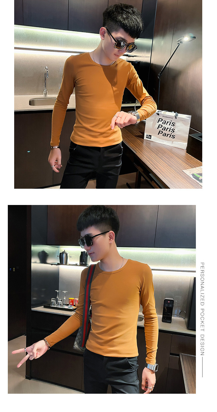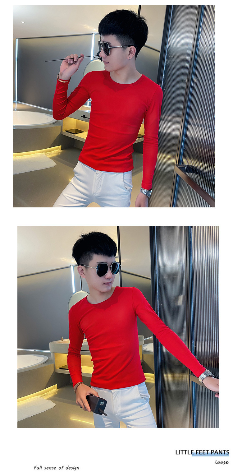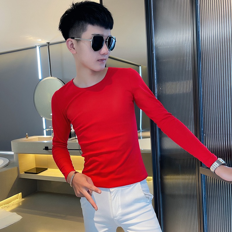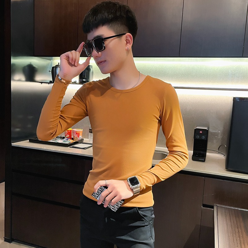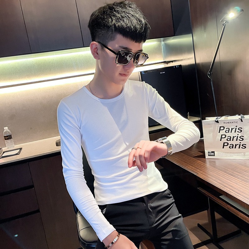 고탄력 타이트 보텀 셔츠 가을과 겨울 밀착 내부 작은 라운드 넥 탑 퓨어 화이트 남성용 긴팔 티셔츠 슬림핏